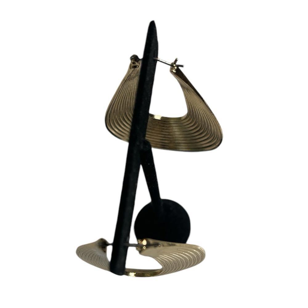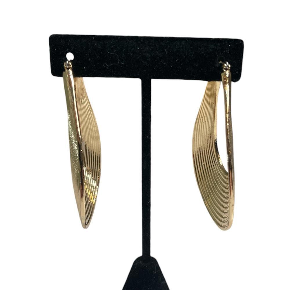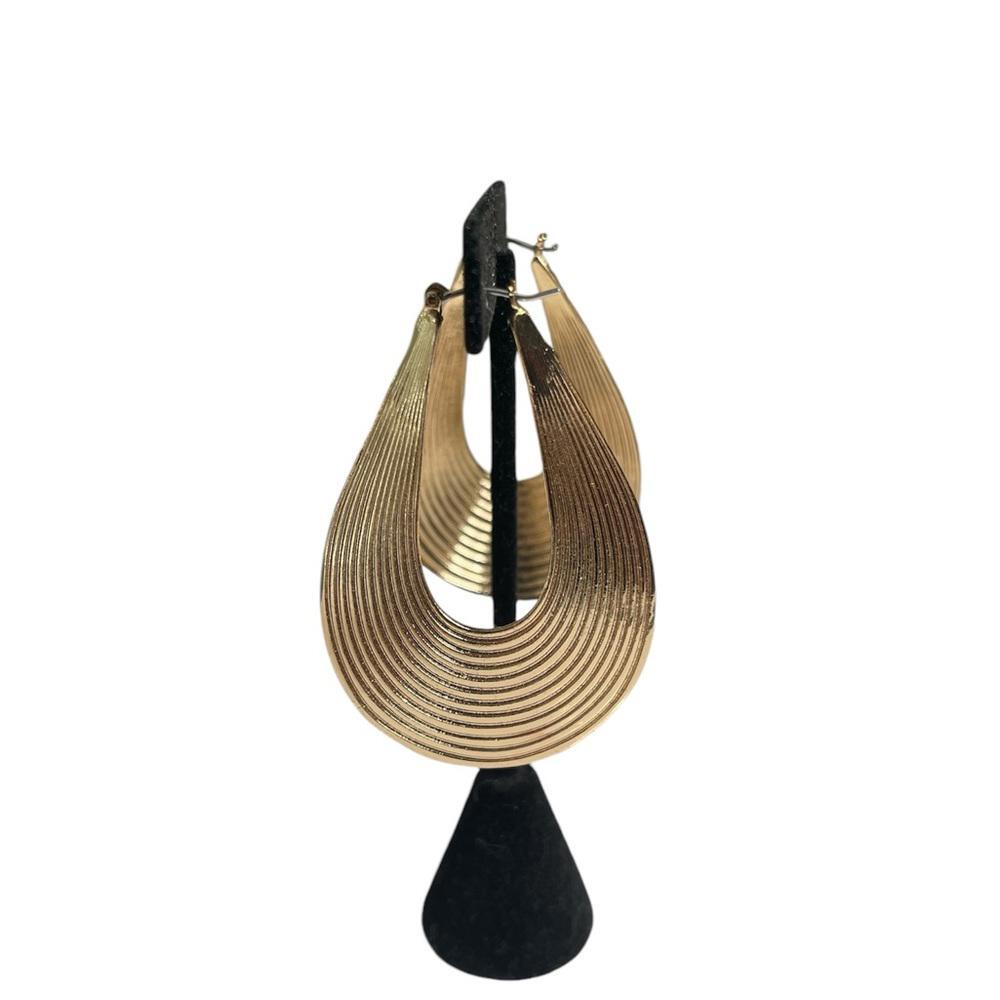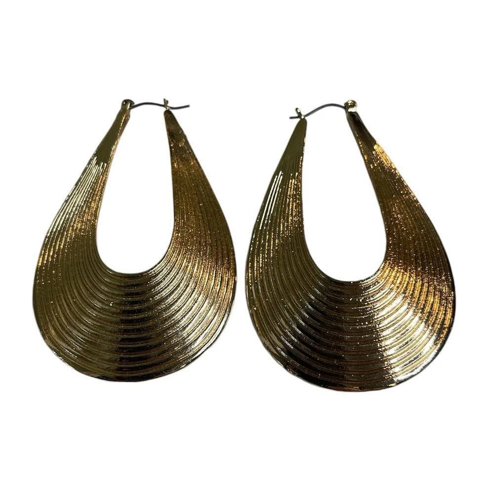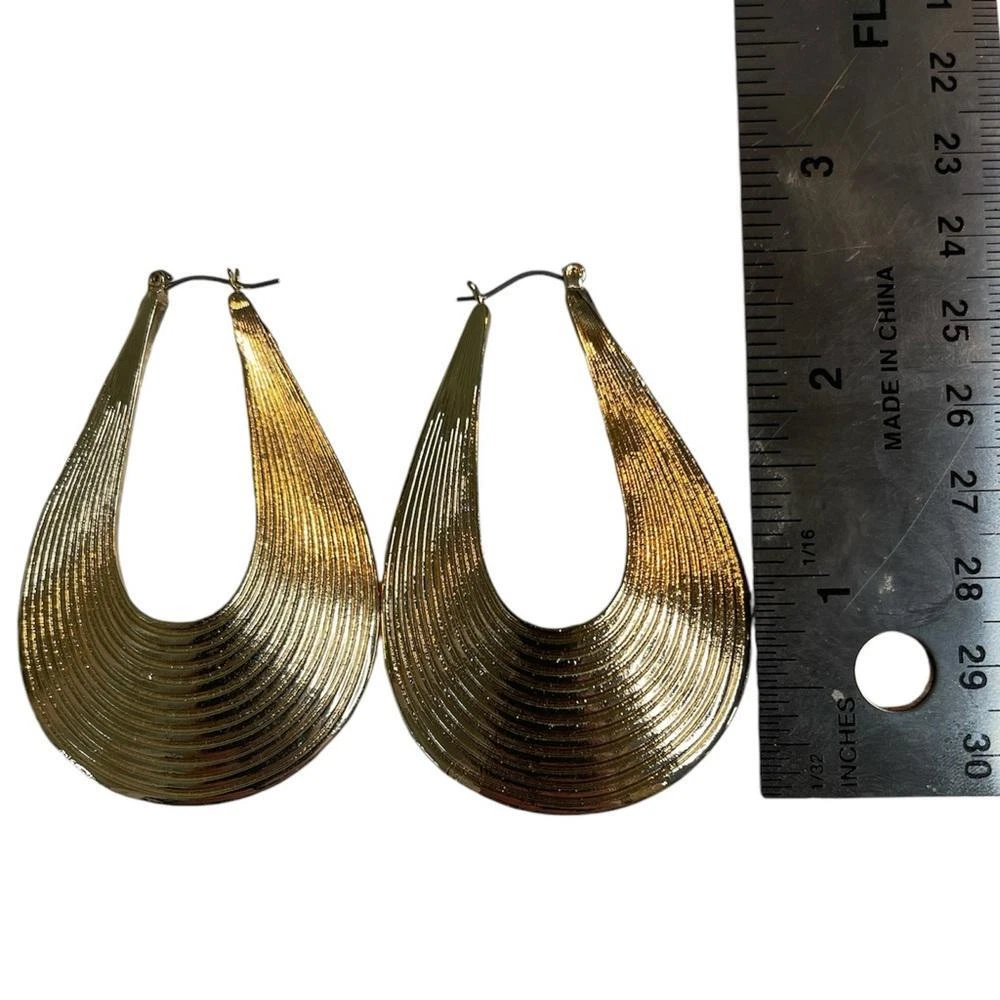 These earrings are large, gold-toned, teardrop-shaped hoops with a ribbed, textured design. The texture creates a series of concentric, curved lines, adding depth and shine. The top of the earrings tapers into a narrow loop where the clasp is located. Their bold, metallic design gives off a statement jewelry vibe, ideal for making an impression with a glamorous or elegant outfit. Approximately 2 1/2” dangle Sensitive Metal fashion earrings Packaged in plastic sleeve, perfect for gift giving or just for your self Make sure you check out my closet for additional fun earrings!