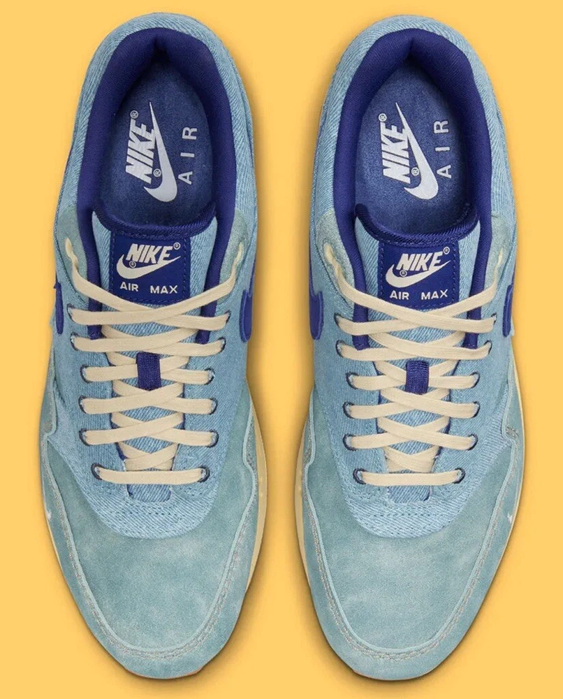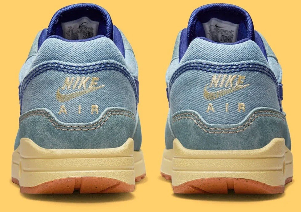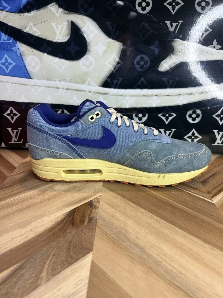 This is a pair of Nike Air Max 1 Premium Denim sneakers in size 11.5 for men. The shoes feature a low top shoe shaft style, blue denim upper material, and a retro design. They are part of the Nike Air Max product line and are a limited edition release from 2022. The sneakers are branded with Kith, Supreme, Cpfm, Travis, Exclusive, and Scott, and are nicknamed "Dirty Denim."