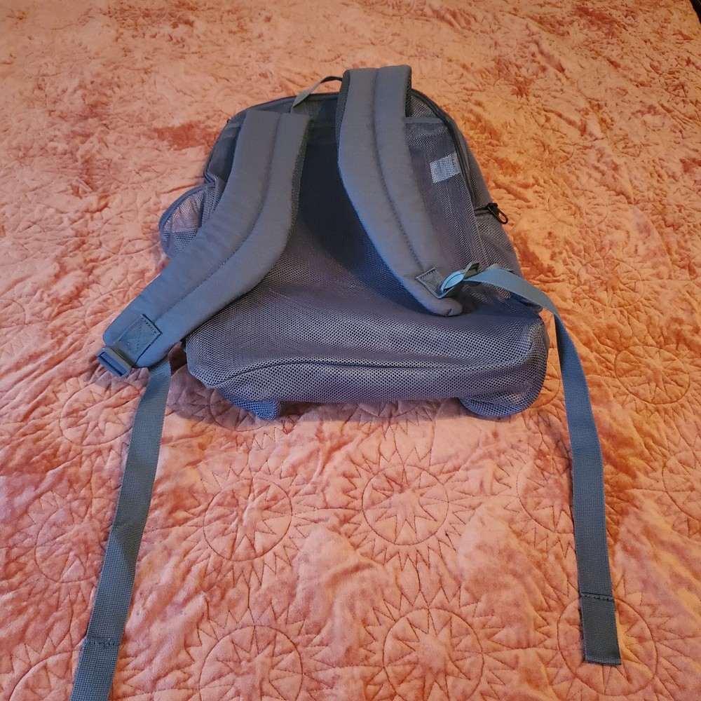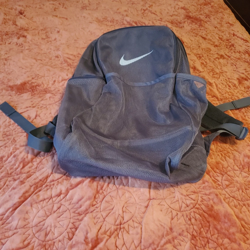 This is a large Nike Brasilia Mesh Training Backpack in gray, designed for unisex kids. It features a solid pattern with a see-through mesh fabric type, a zip closure, and a school theme. The backpack is 12 inches wide and 16 inches high, made of polyester material. It is suitable for back-to-school use and is brand new without tags. if you have any question feel free to message me
