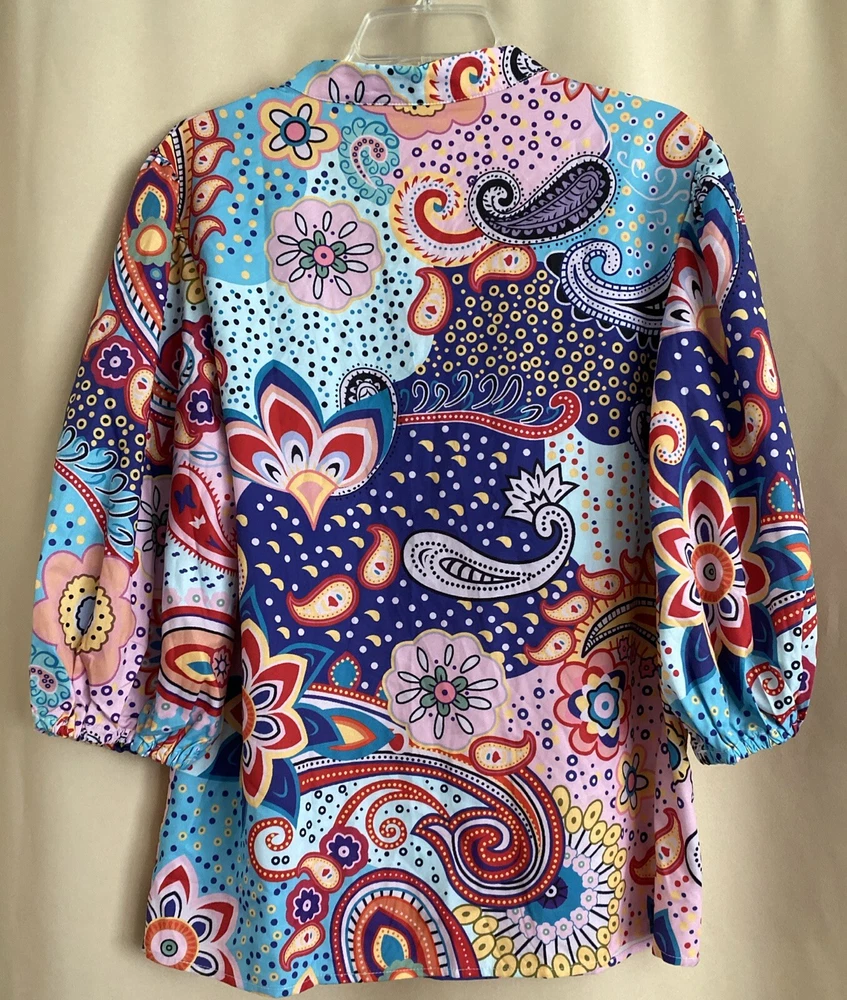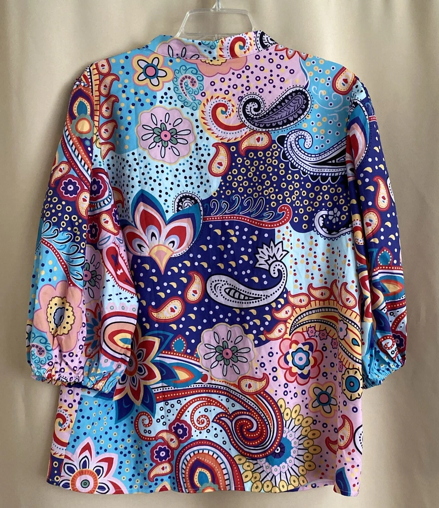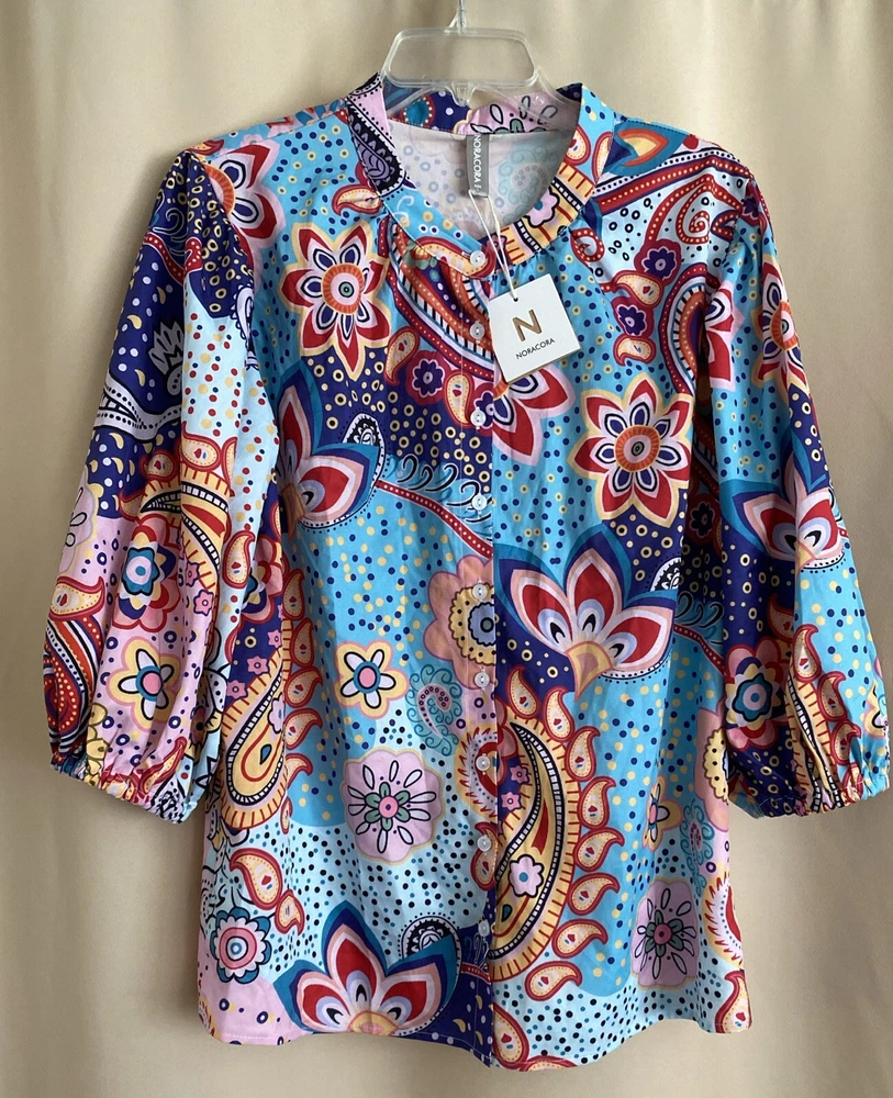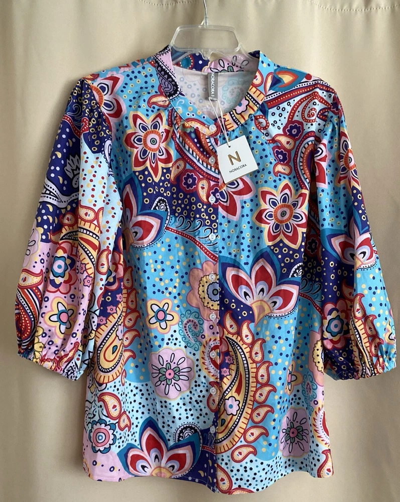 This Noracora blouse is a vibrant addition to any wardrobe. The colorful floral pattern is perfect for any occasion, whether it's a casual day out or a business meeting. The blouse features a round neckline and 3/4 sleeves, making it versatile for all seasons. Made of lightweight polyester, this blouse is easy to care for with hand wash/dry clean instructions. The regular fit is flattering and comfortable, while the multicolor design adds a touch of fun to any outfit. This blouse is perfect for those who love flowers and colorful patterns.