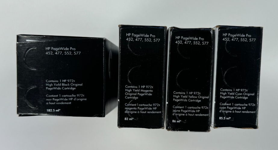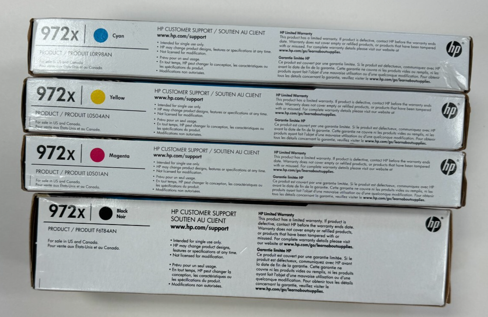 YOU ARE BUYING A 1 SET x New OEM Genuine Sealed HP 972x high yield Ink Cartridges - 2028 Expiration All units are in great condition and will be packed carefully. Please see attached photos of one of the actual modules that you are buying. IN STOCK and READY TO SHIP SAME DAY PAYMENT METHOD eBay's accepted payments SHIPPING § We process and ship orders Mon Day – Fri Day, except for holidays. § HAWAII , Puerto Rico & ALASKA will cost extra. Please contact us for additional information. § Item will ship via UPS or USPS. Other shipping carriers will be determined upon request. § We do ship to PO Boxes & APO/FPO addresses, but there will be an extra fee in most cases. § If needed we will ship the item in a double box for extra protection. § Shipping fee includes handling & packing materials. § No Local pickups § Insurance is included in the cost of shipping. § Most purchases will ship out within 24 Business hours, but in some cases, some items might take up to 2 business days. RETURN POLICY We guarantee the item you purchase is the item we describe. In the event of refund due to sellers fault (if we ship a wrong item), full purchase price will be refunded with the shipping cost. For all other returns can only ask for an exchange, no money back. You have 3 days from the receipt of your purchase to report any discrepancies. All returns must be authorized and an RMA has to be issued. Please check the compatibility of the item you are buying. It is the buyers' responsibility to check the compatibility before payment. If you are not sure please contact us. For computer memory please consider the types like ECC, REG, UNBUFFERED, SERVER OR WORKSTATION MEMORY. Items returned for incompatibility will be subject to return with shipping at buyer's expense and a 15% restocking fee. For a non-working item, buyers can only ask for an exchange. Items must be returned in original packaging or similar packing. If you receive any item damaged in transit, please notify us immediately. Original packaging must be intact. FEEDBACK Our goal is to provide 5 ***** experience to every buyer. If you have any questions regarding your purchase or any of our policies please feel free to contact us. If you are not fully satisfied with your purchase please make sure to contact us with your questions or concerns, and we will address them. Your positive feedback is our inspiration to provide the best product and service to our customers. MORE ITEMS @ OUR STORE We sell all types of Electronics and related accessories. Please visit our store at http://stores.ebay.com/laptopacc