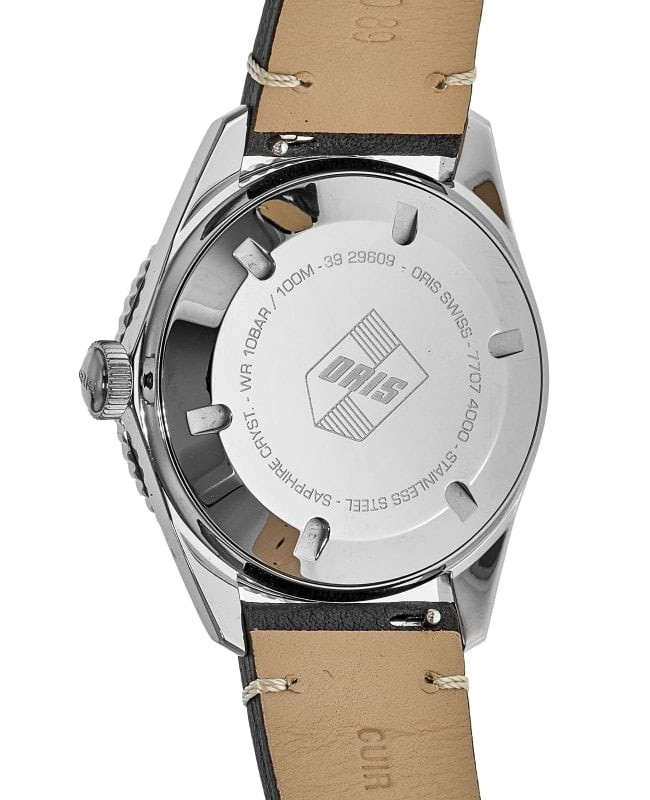 Case Material: Stainless Steel Reference Number: 01 733 7707 4053-07 5 20 89 Model: 01 733 7707 4053-07 5 20 89 Bezel Type: Uni-Directional Rotating Movement: Mechanical (Automatic) Features: Water Resistant up to 100 m Warranty: 2-year warranty by WatchMaxx Case Size: 40.00 mm Caseback: Solid Seller Warranty: Yes Case Finish: Brushed and Polished Face Color: Grey Closure: Tang Band Color: Black Department: Men's Indices: Circle & Stick Style: Luxury Band/Strap: Leather With Manual/Booklet: Yes Band Material: Leather Gender: Men's Dial Color: Grey UPC: Does not apply Type: Watch Water Resistance: 100 Meters - 330 Feet Watch Shape: Round Case Thickness: 13.14 mm Brand: Oris With Original Box/Packaging: Yes gtin13: Does not apply
