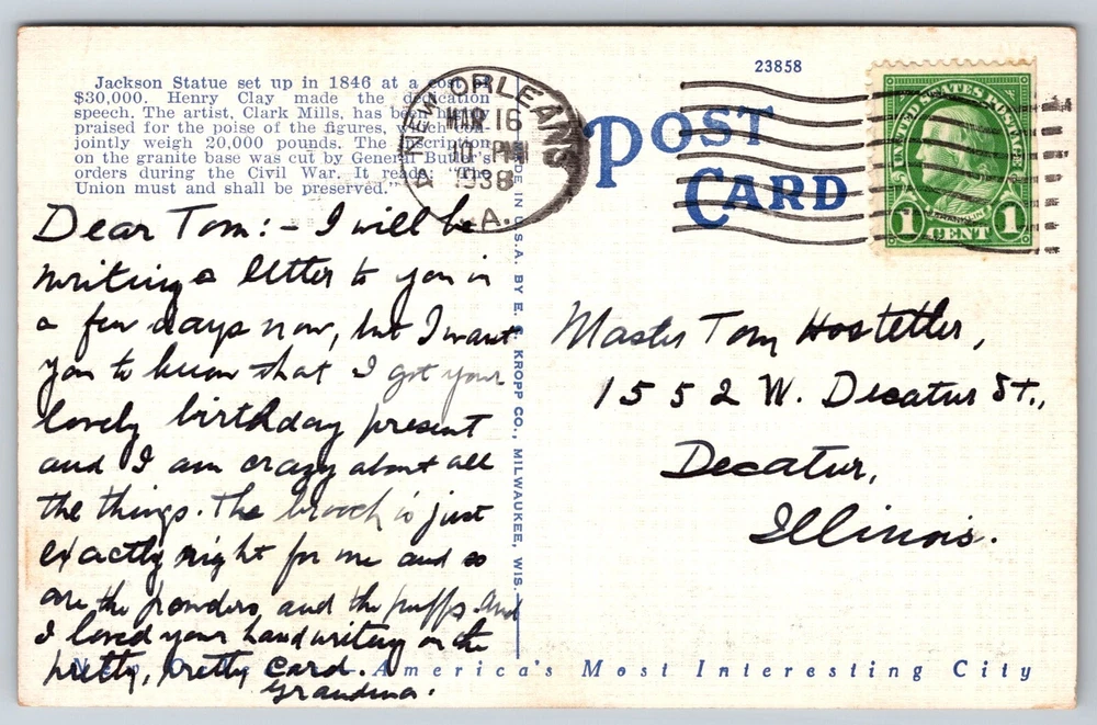 WELCOME TO People And Places Of The Past Here you will find unique antique photographs, real photo postcards, and other vintage postcards that can be used for collecting, genealogy, or crafting. Many of these historic photographs are rare, hard to find, and are one-of-a-kind images that cannot be found anywhere else. Please visit our ebay store and Thank You for shopping with us! This vintage, antique post card is in good condition. Please see high resolution pictures of the front and back of this card closely for detailed cosmetic condition prior to purchase. This post card measures 3.50 inches x 5.50 inches. This post card will be shipped to you packaged well inside of a clear plastic sleeve, inside of a quality 250 GSM rigid, stay flat envelope to keep the card flat and to protect the card during shipping within the United States. A FRAGILE or DO NOT BEND sticker will be applied to the outside of the envelope. Your post card will be delivered to the post office the same day, or the next business day, after receiving payment. Bad weather and holidays can affect delivery times. Returns are accepted within 30 days of purchase. Shipping Options: Choose One That Is Best For You For Cost And Speed Of Delivery 1. EBAY STANDARD ENVELOPE ( Standard USPS First Class Mail ) - Basic protection with no tracking or minimal tracking with this option. 3 - 6 business days estimated delivery. 2. USPS GROUND ADVANTAGE - Full bar code tracking available with this option. Cardboard protection added around postcard. 2 - 5 business days estimated delivery. 3. USPS PRIORITY MAIL - Full bar code tracking available with this option. Cardboard protection added around postcard. 1 - 4 business days estimated delivery. Each item is inspected, packaged, weighed, and sealed individually for FAST SHIPPING! We try our best to represent the item in the images as accurately as we can. However, due to variations in color in image scanners, computer screens, and cell phone displays, the color may be slightly different than the actual product. Vintage post cards and photographs can show normal signs of wear associated with an antique image including curling, bends, folds, creases, holes, dents, stains, rips, scratches, worn edges, fading, crackling, handwriting, fingerprints, postage cancellations, postage stamps, missing pieces, paper or glue residue from being put into or taken out of old postcard/photograph albums, other damage that may not show up from the image scanner, or out of focus by the original photographer. They will have imperfections from being mailed and/or due to their antique age. Thank You For Shopping With People And Places Of The Past! Visit our ebay store at www.ebay.com/str/peopleandplacesofthepast