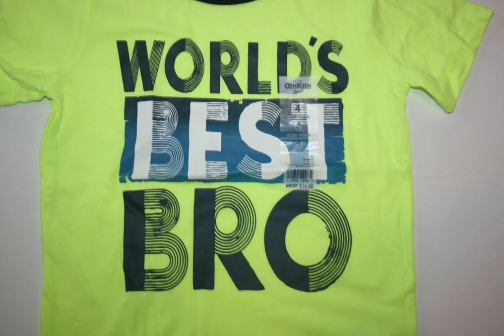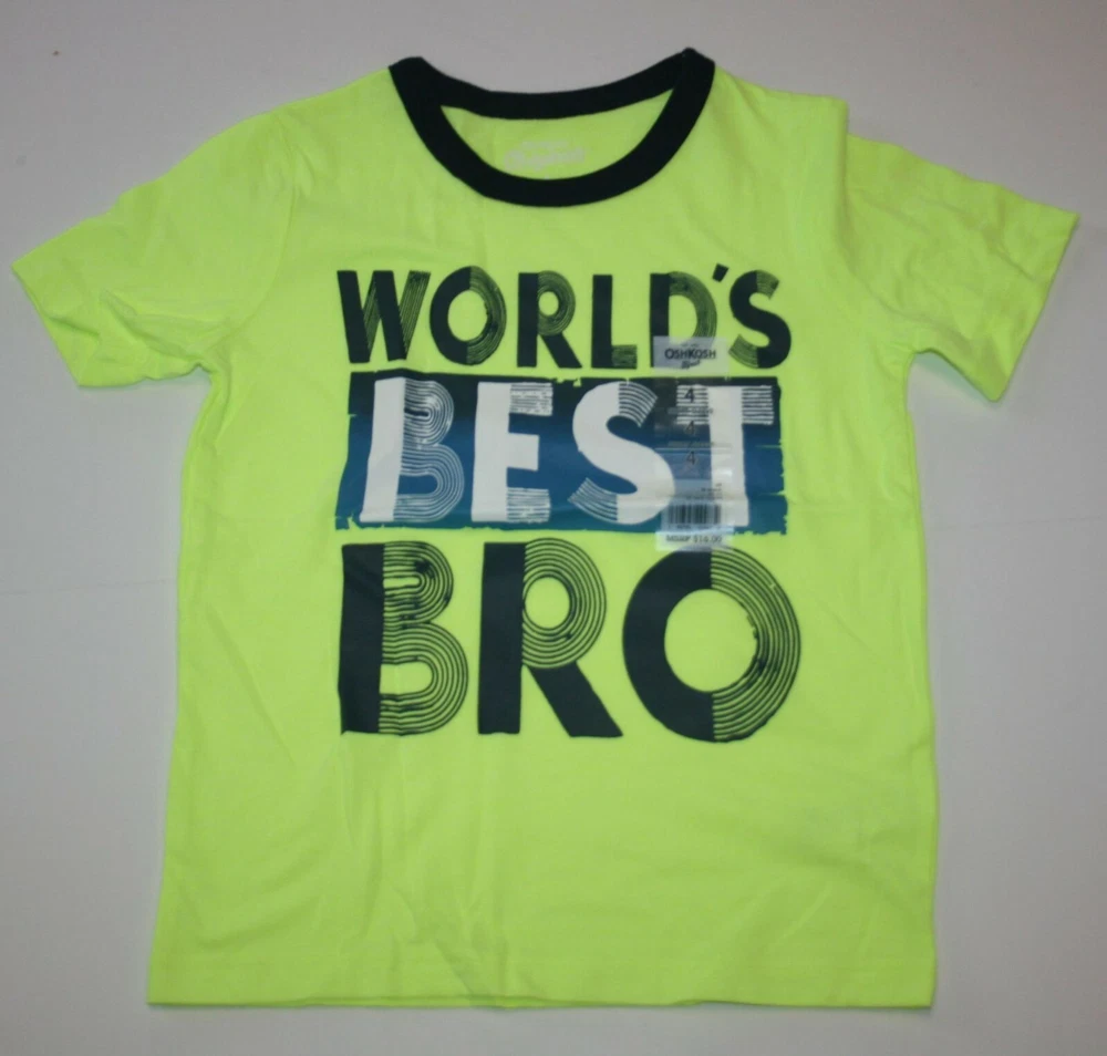 New with Tags OshKosh Shirt or Top Size 12 year 100% Cotton Material Thanks for looking! This is a brand new with tags OshKosh Top. Bright yellow with black trim and reads WORLD'S BEST BRO on front in screen print. Perfect top for your Big Brother. No flaws - this is brand new. Perfect for a present or gift. Smoke free home. I do my best to make sure that any flaws are found before listing. If I completely misrepresent an item or I have missed something please contact me and we will work something out. Happy Shopping!