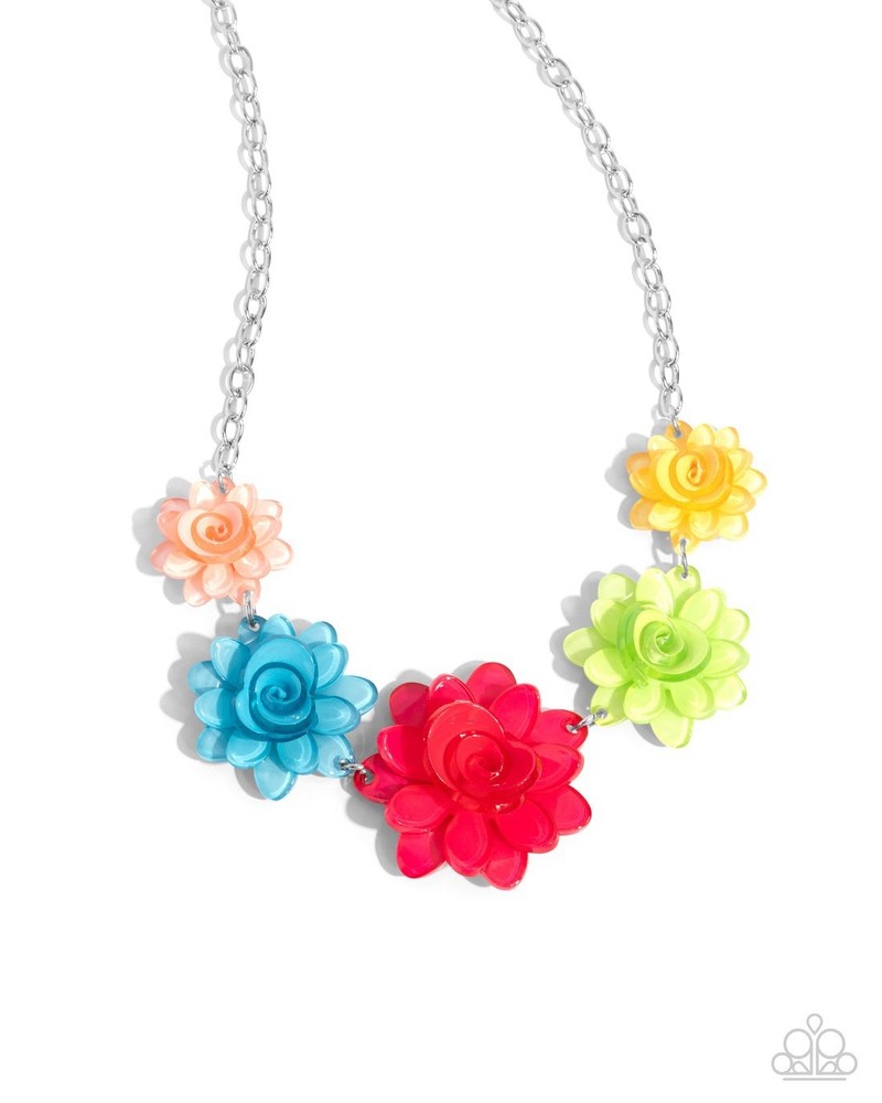 Featuring a multicolored display of glassy acrylics, three-dimensional flowers bloom below the neckline from an abstract high-sheen silver chain. The swirled centers of each flower create additional texture and depth, further highlighting the spectrum of color at play. Features an adjustable clasp closure. Sold as one individual necklace. Includes one pair of matching earrings.