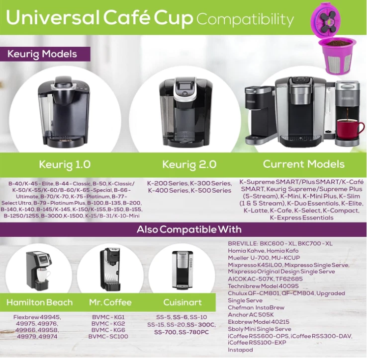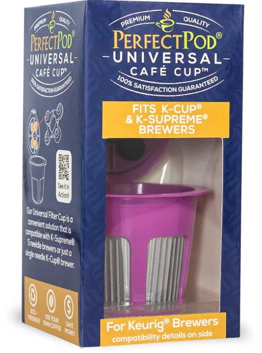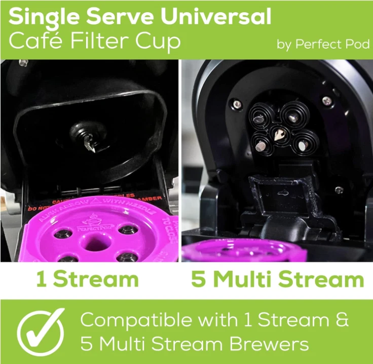 Perfect Pod Single Serve Universal Reusable Coffee Filter Cup, Multistream Technology About this item: UNIVERSAL : Compatible with both single-stream and multi-stream coffee brewers. No adaptors are needed, no need to add or remove parts. Just fill, place & brew. REUSABLE : Save money, enjoy better coffee, and reduce waste by going reusable. EASY TO USE : No adapters or special parts are required – just fill, place and brew! Dishwasher safe for easy cleaning SAVES MONEY : – enjoy your favorite coffee while spending up to 80% less than on expensive pre-filled K-cups QUALITY : Don't fall for subpar copycats. Perfect Pod is the industry leader based in Los Angeles, CA, and was founded in 2005. Each Perfect Pod product is developed by our team of engineers, rigorously tested, and manufactured with the highest quality standards. Product details: Universal Compatibility! Take the guesswork out of reusable, this cup is designed to work with both 1-Stream and Multi-5 Stream Single Serve Brewers, so you don't need any extra parts or adaptors. Constructed from high-quality BPA-free plastic and durable stainless mesh for long-lasting durability. The Single Serve Universal Reusable Coffee Filter Cup is compatible with the Keurig 1.0, 2.0, K-Mini, and K-Supreme brewers & more! (See Compatibility Graphic). Feel confident that your purchase is 100% Satisfaction Guaranteed! Get brewing today with Perfect Pod's Universal Coffee Cup. Save Money, Enjoy Better Coffee, & Reduce Waste with Perfect Pod.