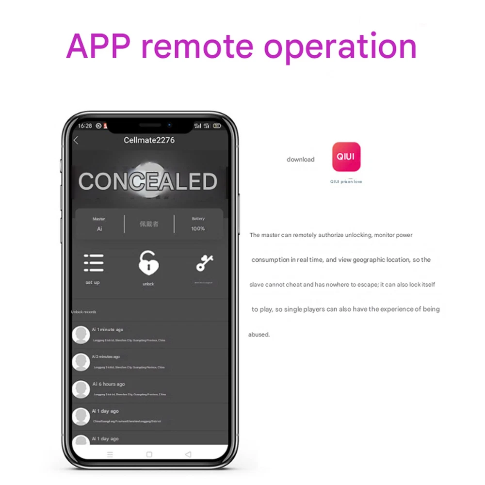 Description *Material: PC matte material *Weight: short 60g; long 80g (Note: There will be a little error in the size of the product due to the difference in measurement methods, measuring instruments, factory production batches, etc. Generally, the error of ± 2 mm is normal, and it is not a quality problem or the size description does not match, thank you) All toys will be shipped to you in a discreet package, no one knows what you got. If you have any questions, please contact us first. If you feel uncomfortable during use, please stop using it immediately The product uses APP application control, can remotely control unlocking, and can be remotely controlled anywhere! Deeply experience the sense of bondage.