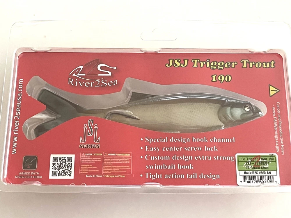 This RIVER2SEA JSJ Trigger Trout 190 swimbait is a great addition to your tackle box. Designed for all freshwater fish species, this 7.5\" soft swimbait has a negative buoyancy and a weedless glide action. The shasta trout color and realistic bait shape will attract even the most hesitant fish. Made of soft plastic material, this swimbait weighs 3oz and comes in a pack of one. Perfect for freshwater fishing, this JSJ series model is a must-have for any angler. Get ready for an exciting fishing experience with this new RIVER2SEA swimbait.
