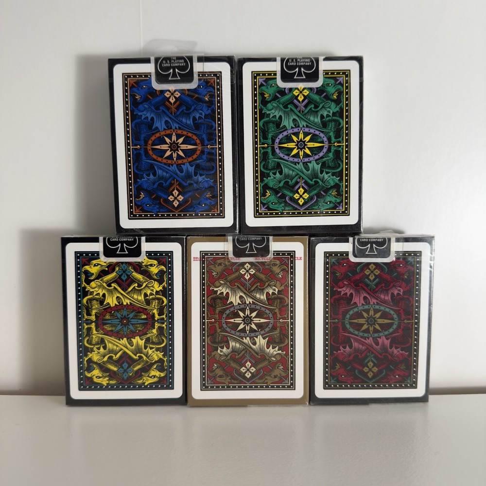 This product is a rare set of 5 full decks of Bicycle playing cards featuring a unique dragon back design. As a collector's item, this set is highly sought after for its exclusivity and quality. Each deck is made by Bicycle, known for producing top-notch playing cards that are both durable and stylish. This set is perfect for collectors or anyone looking to add a special touch to their card game experience.