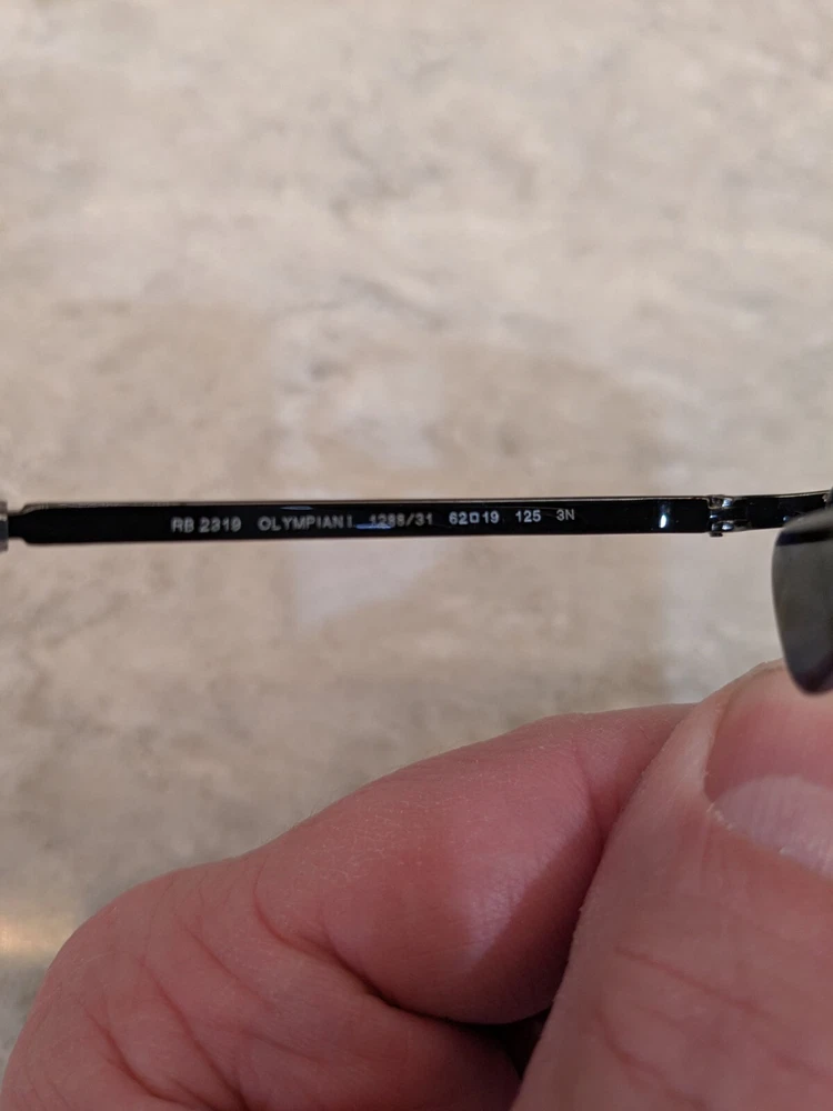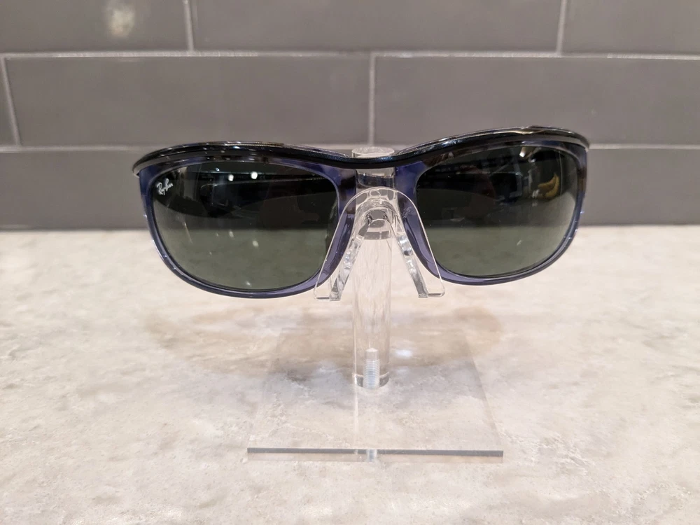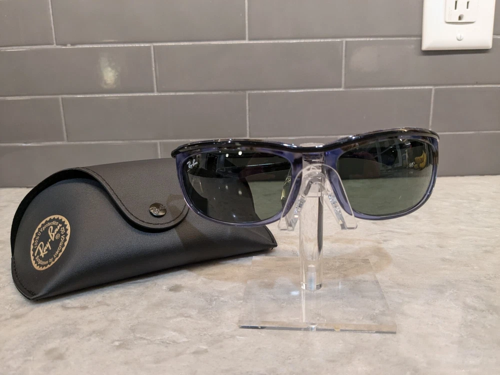 New Ray ban 2319 Olympian 1 sunglasses. Color code 1288/31 is a blue/black tortoise frame with G15 tinted lenses. Size 62-19-125 has sport temple. This wrapped frame is good to be worn as is or take it to your local eye care provider to have your personal prescription installed. Ray-Ban Case included.