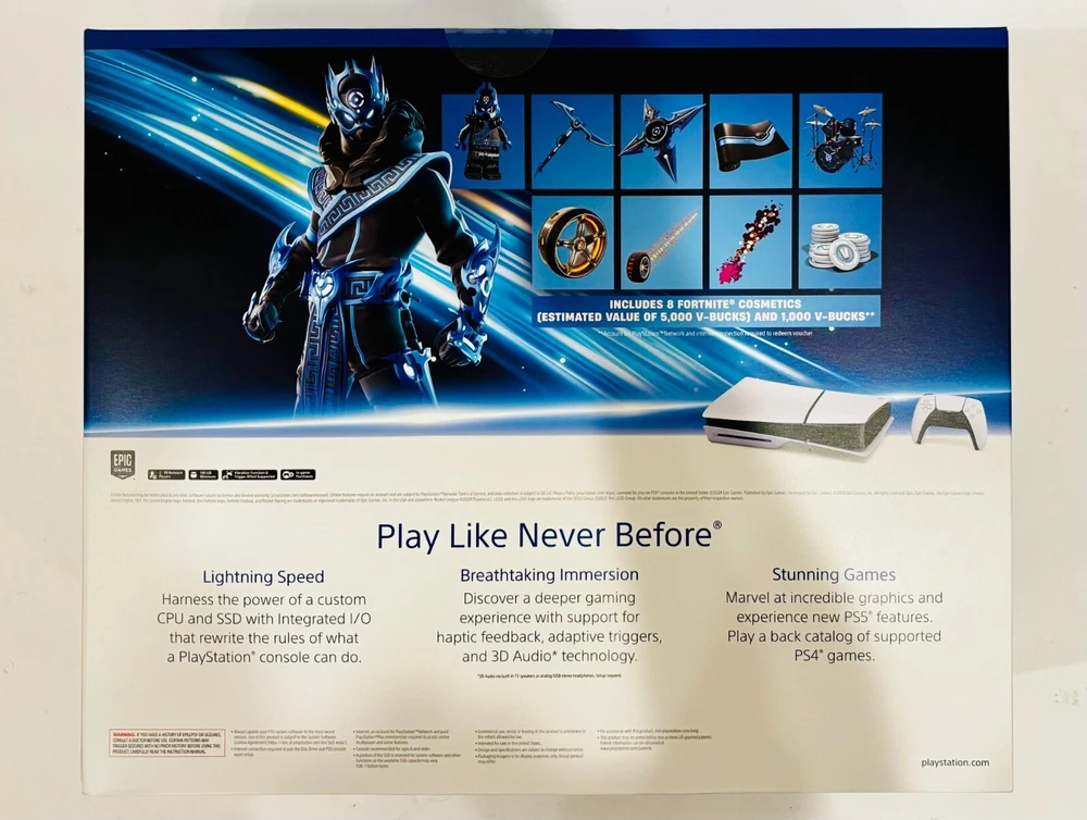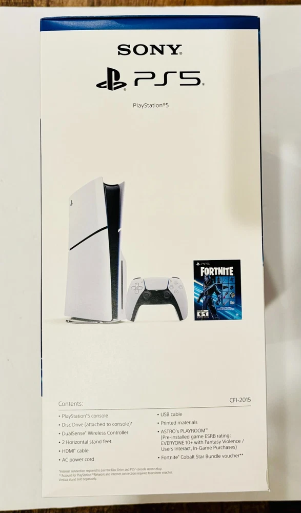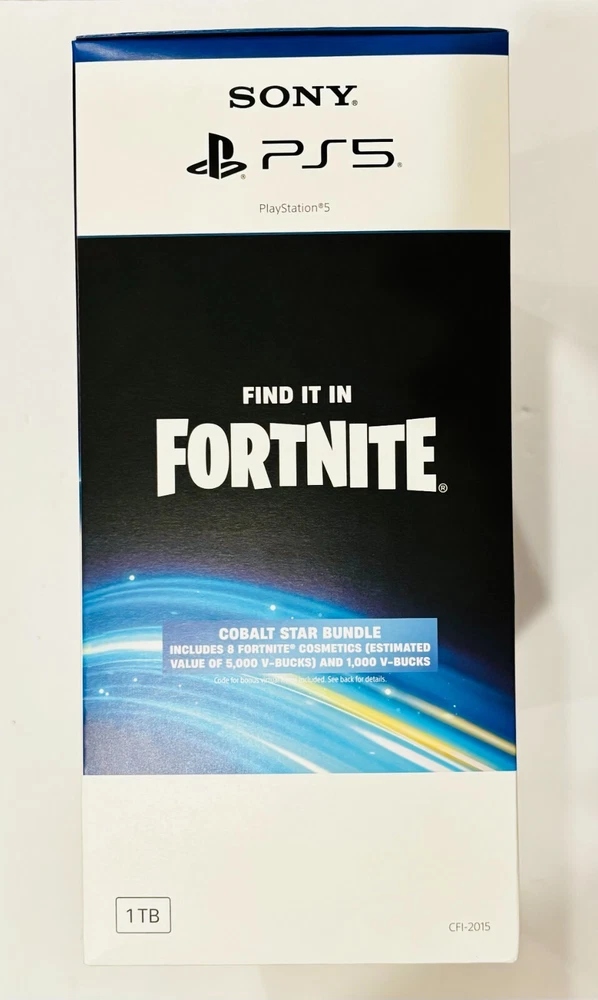 New Sony PlayStation 5 Slim 1TB Disk Console with Dual-Sense Controller with exclusive Fortnite Cobalt Star Bundle in the original sealed box with the original box content