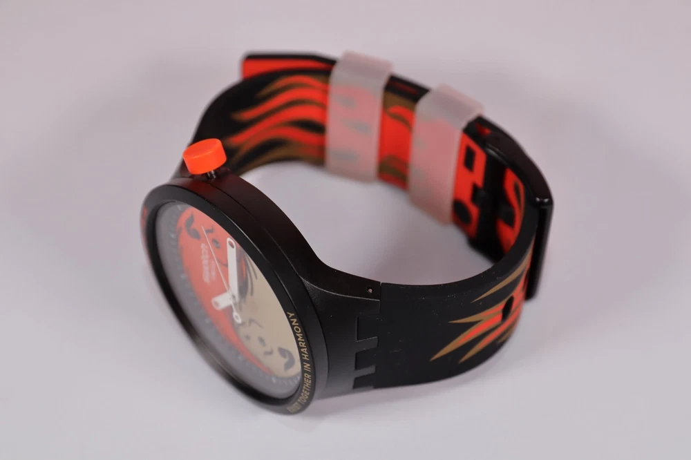 Nothing shouts BIG BOLD like the OX does. OX ROCKS 2021! (SO27Z109) is a must-have celebratory piece for the Chinese New Year and it comes right on time. Warmed up by the fiery black, red and gold-colored strap, the dial represents the perfectly harmonious Ox in a Ying and Yang shape, adorned with two black crystals. Movement : Quartz Water resistant : 3 Bar Collection : Special Packaging : Special Diameter : 47.00 mm Thickness : 11.75 mm Lug-to-lug : 44.80 mm Strap material : Silicone Clasp material : Aluminium Strap buckle : Half Buckle Case material : Polymer Color : Black Strap color : Black Dial color : Red Case color : Black Product family : BIG BOLD