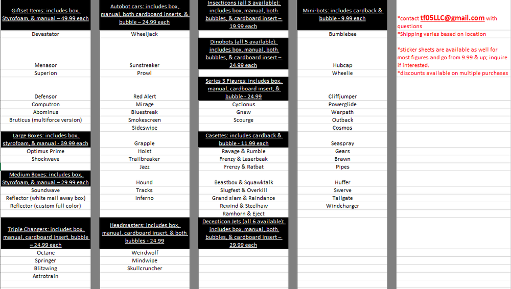 Listing Info: Discounts are available if you purchase multiple items at once; contact me BEFORE making your purchase. I have lots of custom boxes, manuals, stickers, etc. available for G1 figures; see the rightmost image for a list of them. Item details: Amazing quality custom G1 items; good for resealing your items to display them, increase their value, or get them graded! Look so much like the vintage ones that it is almost impossible to tell them apart! All boxes/inserts are glossy & made of thick card stock, bubbles are made of strong plastic, and manuals use sturdy paper products with ink that will not smudge! This listing includes everything shown in the pics above! Shipping: All items ship from the US; so you get them fast, don't have to worry about customs, or them arriving with crushed boxes, etc. US sales are shipped out via Priority Mail (2-3 business day delivery time) & include tracking. International Sales are shipped out via Ebay's international shipping services. Returns & Terms: Returns are accepted within 2 weeks. If there are any issues with your item(s), please reach out to me before contacting Ebay. By bidding on this listing, you agree to the terms listed & have read this auction fully.