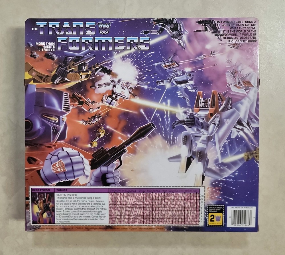 UPC: Does Not Apply Items Included: Box, Cardboard Insert, Instruction Manual, Bubbles Franchise: Transformers Vintage: No Movie: Transformers Time Period Manufactured: 2010-now Type: Action Figure Theme: Transformers & Robots Transformer Faction: Decepticon Original/Licensed Reproduction: Licensed Reproduction Character: Thrust Brand: Unbranded TV Show: Transformers gtin13: Does Not Apply