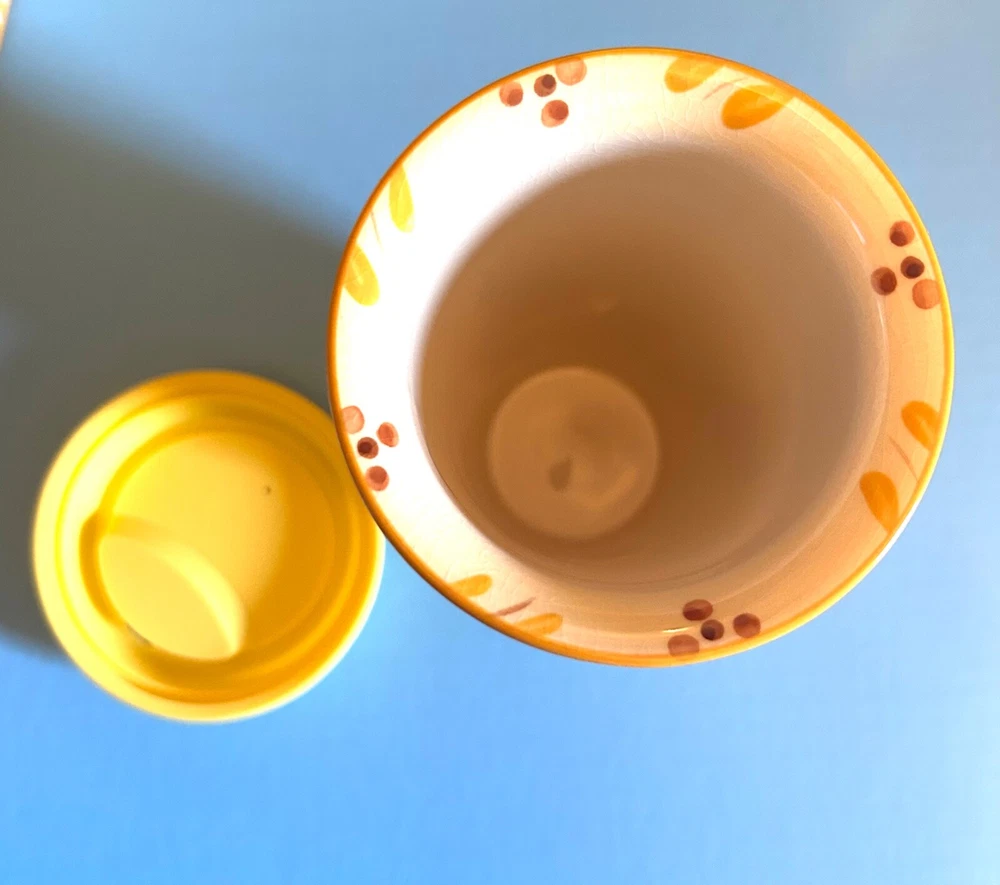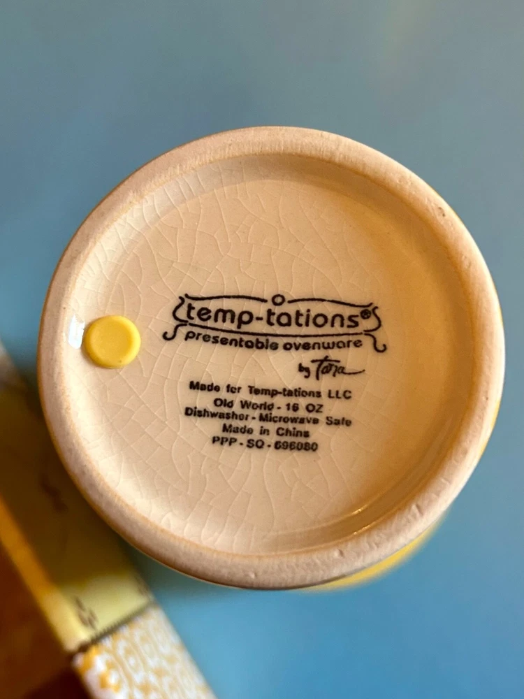 Temp-tations Old World by Tera Hand Painted Yellow Ceramic Travel Tumbler Cup w/ Lid & Band is New in the Original Box. Capacity: 16 fl oz Manufacturers Name Style/Color: Old World/Yellow Good weight - Not flimsy Double Wall insulation. 3.5” W at the top x 7” Ht 7.5” Ht w/lid. See all Photos for Details