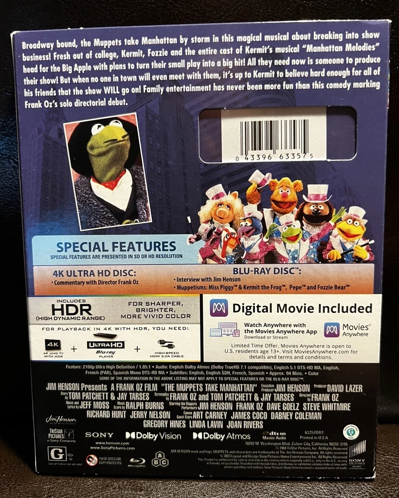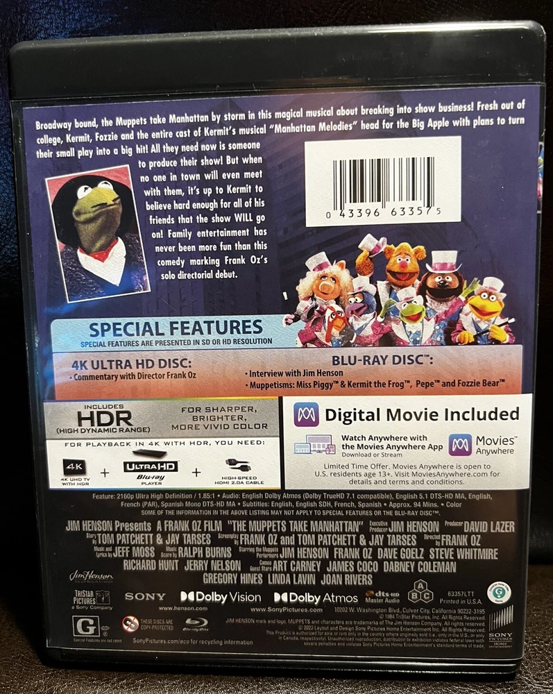 gtin13: 0043396633575 Genre: Comedy Video Binding: 4K Producer: Jim Henson, David Lazer Format: Ultra HD UPC: 0043396633575 Subtitle Language: Chinese, Danish, English, Finnish, French, German, Greek, Hindi, Korean, Norwegian, Portuguese, Spanish, Swedish, Thai, Turkish Language: English, French, German, Portuguese, Russian, Spanish Rating: G Sub-Genre: Family Type: Movies & Television Studio: Sony Pictures Director: Frank Oz Actor: Juliana Donald Movie/TV Title: The Muppets Take Manhattan Run Time: 94 min. Aspect Ratio: 1.85