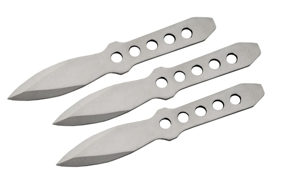 New Throwing Knives 3 Piece Set Stainless Steel Silver + Sheath Upgrade your gear with this compact, reliable 3-piece stainless steel throwing knife set! Each knife measures just 5″ overall, giving you precision and control in a lightweight package. Crafted from high-grade stainless steel, these blades resist corrosion and hold a razor-sharp edge through repeated use. The included rugged nylon sheath keeps all three knives secure and organized, whether you’re on the trail or in your workshop. Key Features: 3-Piece Set 5″ Overall Length Stainless Steel Blades: Durable, corrosion-resistant construction Nylon Sheath: Tough, water-resistant sheath with belt-carry capability Perfect as a gift or addition to your own kit.
