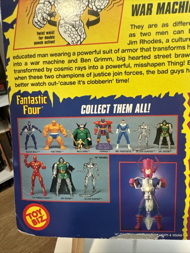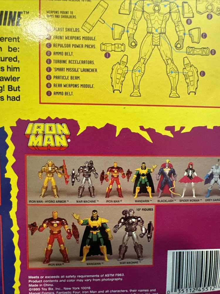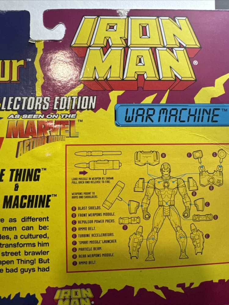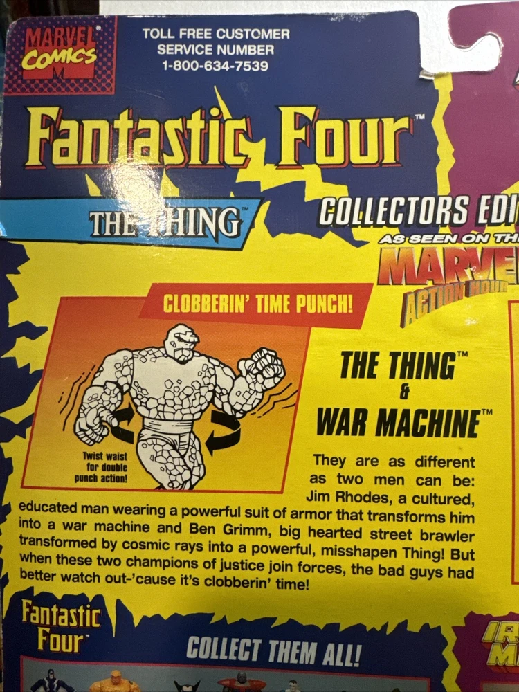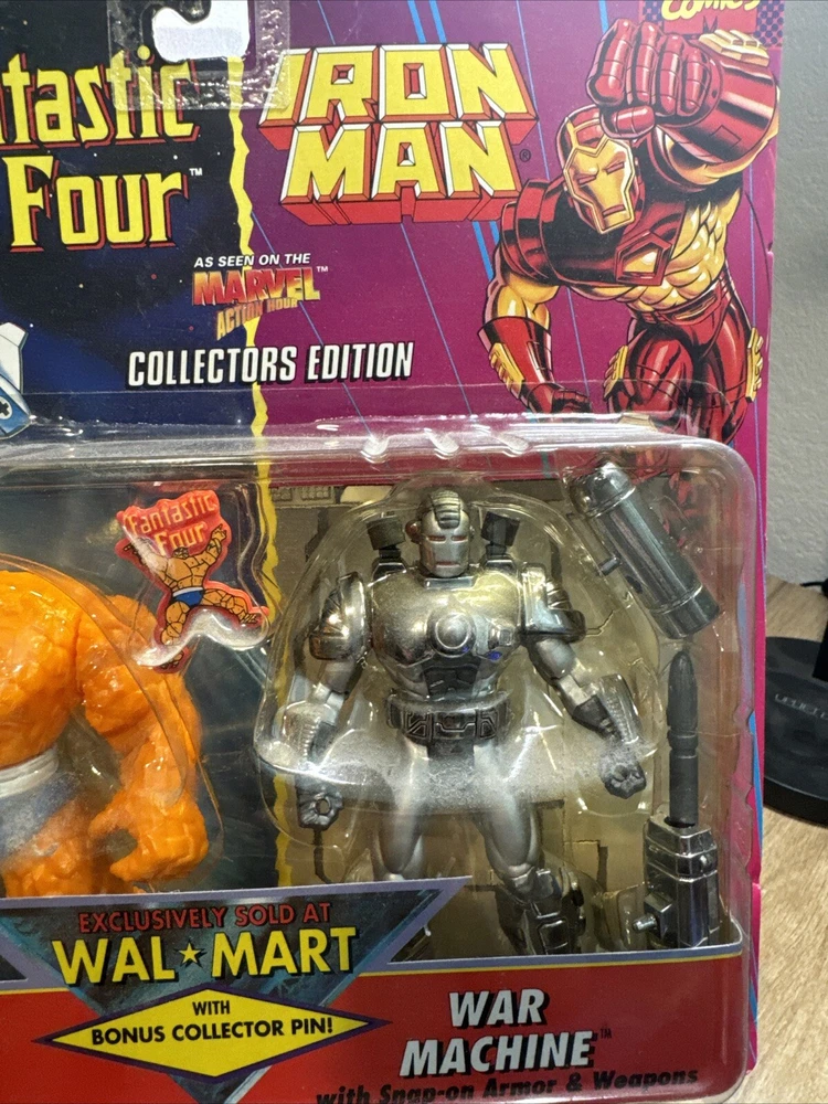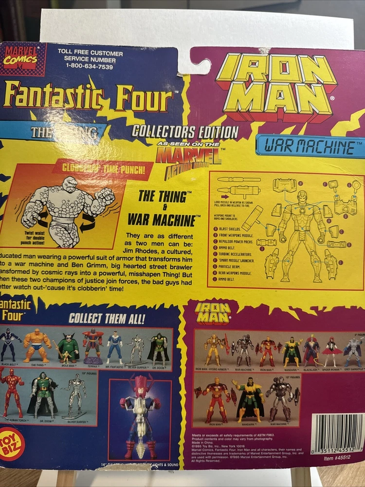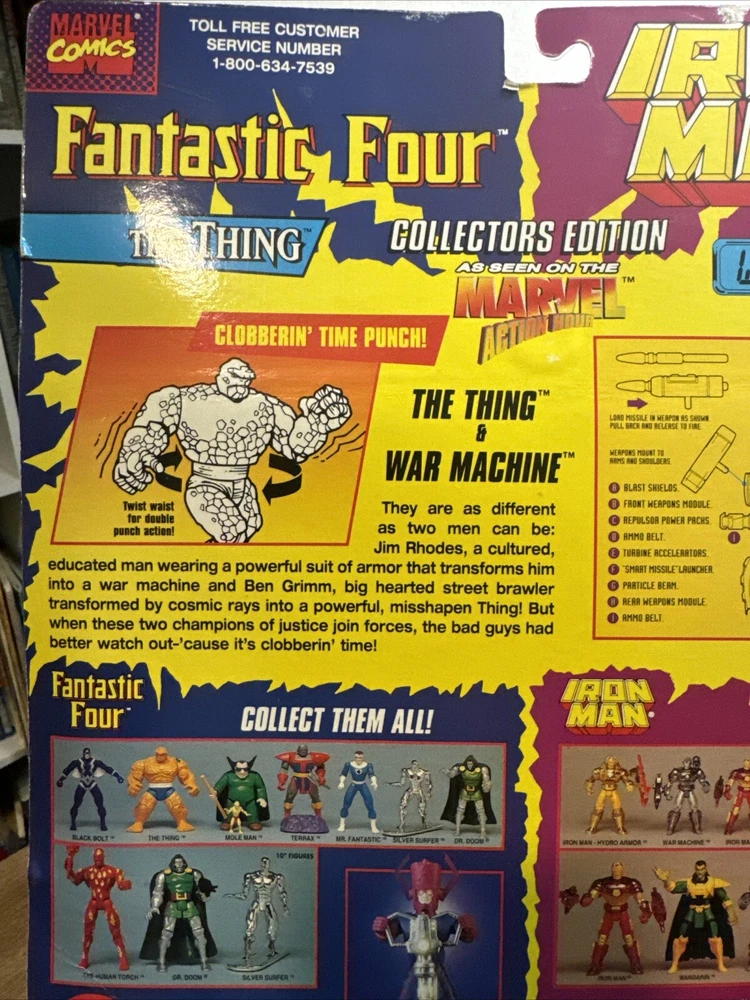 Vintage: Yes MPN: 45512 gtin13: 0035112455127 Original/Licensed Reproduction: Original Theme: Comic Book Heroes Time Period Manufactured: 1990-1999 Brand: ToyBiz Packaging: Original (Unopened) UPC: 0035112455127 Type: Action Figure Genre: Superheroes Items Included: Bonus Collector Pin, Accessories Country/Region of Manufacture: China TV Show: Marvel Action Hour Franchise: Marvel Universe, Fantastic Four, Iron Man Movie: Iron Man Color: Purple Character: The Thing, War Machine Year Manufactured: 1995 Features: Collector's Edition Material: Plastic Series: Universe