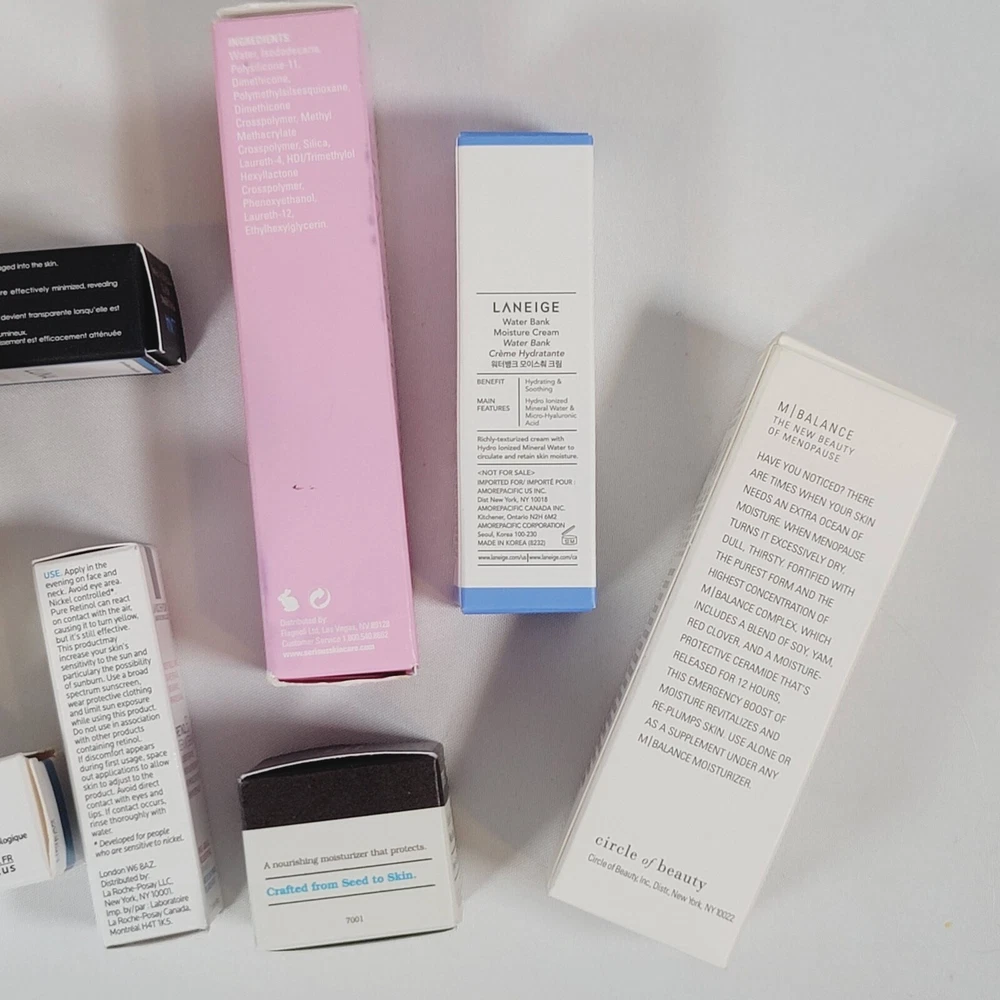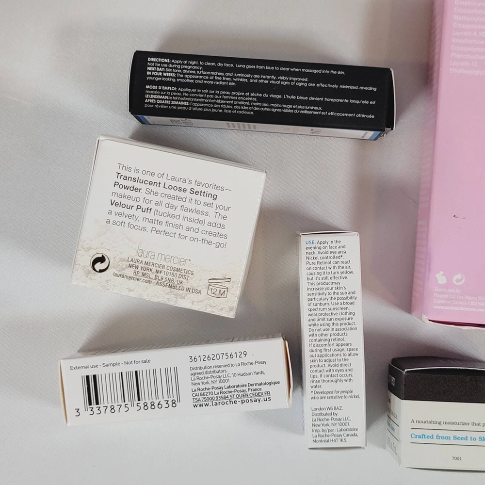 LOT of 8 Travel-Sized Serums, Creams, and More. All brand new in boxes. A couple boxes have minor shelf wear, see pictures, but none have been opened/used. Includes a total of 8 products, retail for these is $10-$30 each, so this is a great chance to save money and try out various products! Lot includes: Laura Mercier: Ready, Set Go! Translucent Loose Setting Powder, 0.33 oz Serious Skincare: Pretty Fast, Diffuse, Poreless Skin Perfecting Serum, 14 ml / 0.5 fl. oz Laneighe Water Bank Moisture Cream, for normal to dry skin, 8 ml / 0.2 fl. oz. M Balance: Re-Start Intensive Moisture Boost, All Levels, 37 ml / 1.25 fl. oz. La Roche-Posay: Lipikar Eczema Soothing Relief Cream, 5 ml / 0.17 fl. oz. La Roche-Posay: Retinol B3 Serum, Anti-Wrinkle Concentrate, Renewing/Resurfacing, 5 ml Sunday Riley / Luna: Retinol Sleeping Night Oil, 7.5 ml / 0.25 fl. oz Primera: Alpine Berry Water Cream, Hydrate + Glow, 5 ml / 0.16 fl. oz Please see all pictures for exact cosmetic condition and other details, as they are part of the description as well, and ask any questions before purchasing. We are a husband and wife team with a growing family, and greatly appreciate your support of our small business. Please browse our eBay store for a variety of other health and beauty products. We hope you enjoy this set!