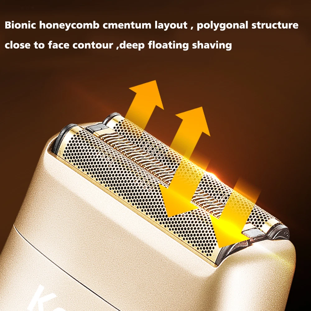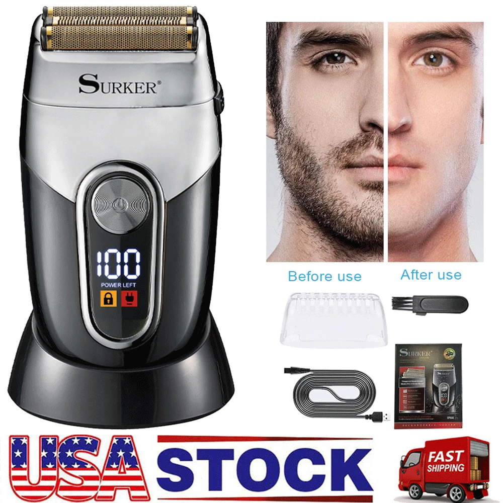 Specifications: Best for hair, beard, stubble, shaved head bump free shaving and super close shaving clean up hair and neck lines for smooth finish cord/cordless shaver shaper a great tool for an extra-close shave on the neck,face and all around the hairline 100-240V voltage,50/60Hz Cord/cordless work powerful and quiet rotary motor gold titanium hypoallergenic foil for irritation-free shaving 2 blade cutting shaving system 600mAh Lithium-ion battery LCD display, charging reminder, battery power percentage reminder contains travel lock function, press and hold the switch for 3 seconds, the machine will be locked, if unlocked, do the same operation USB Line charger model Package Included: 1* T rimmer 1* Protective cover 1* C harger 1* Cleaning brush 1* Manual INSTRUCTIONS FOR USE : 1. Men whose skin is sensitive or easily irritated by shaving, or who suffer from a skin allergy, should test one section on the leg or arm before using the shaver. 2. Remove the protective cover and turn on the unit to start shaving. Hold the shaver at a right angle to the area of your face that you want to shave and run the single shaving foil carefully along your skin. Tip: In general, we recommend that you shave against the direction of hair growth, as this is the best way to trim the hair. Pull your skin tight, with your fingers in inaccessible areas, to achieve optimum results. 3. Do not push the shaver on the skin too hard as it could cause irritation, make the shaver warm and prevent a perfect shave. 4. Please note that it takes 2 to 4 weeks for your skin to adapt to a shaver, so please do not change shaving instruments in this period of time. 5. If hair is longer than 1/32” begin by cutting the hair down first with a trimmer, then use shaver for a smooth close finish.