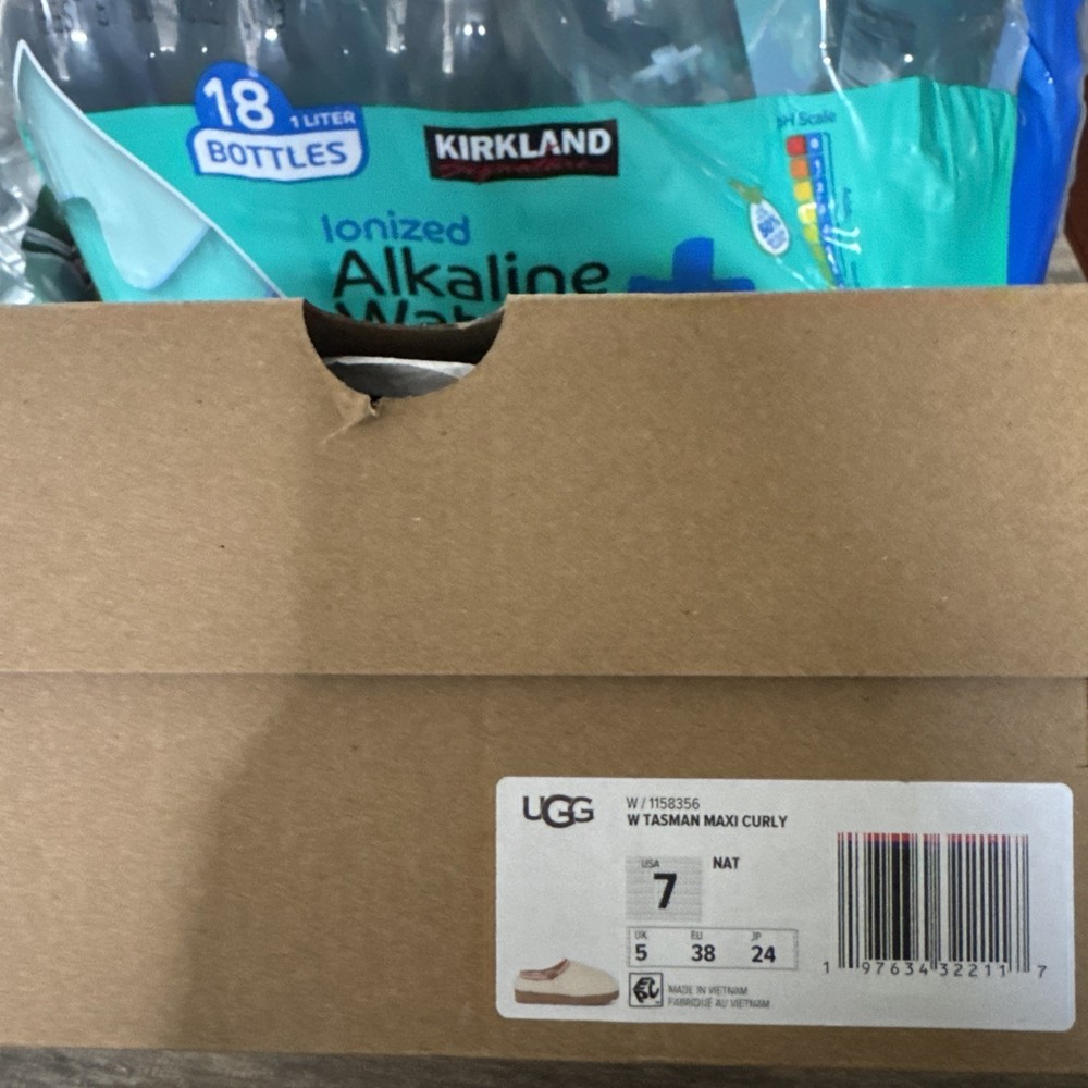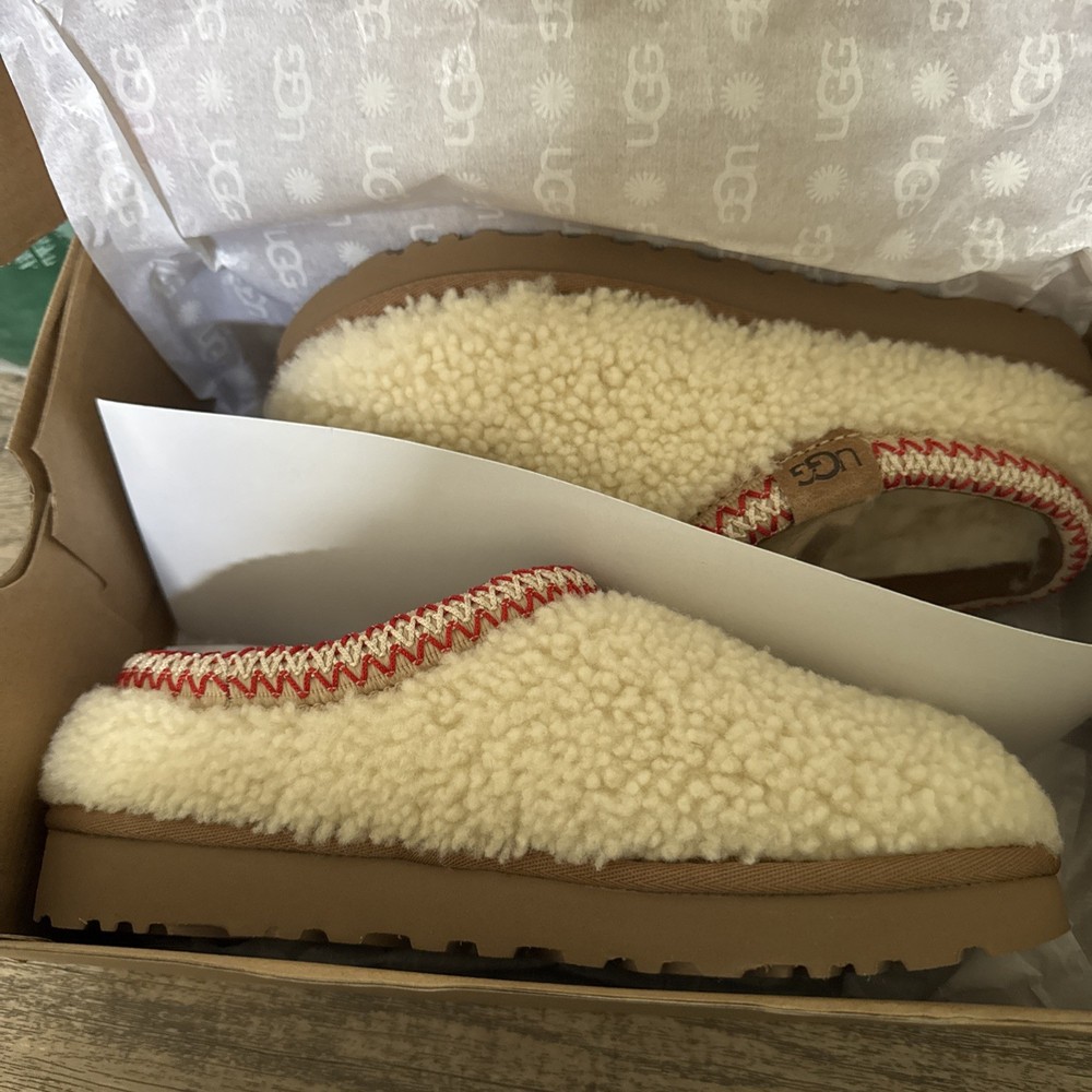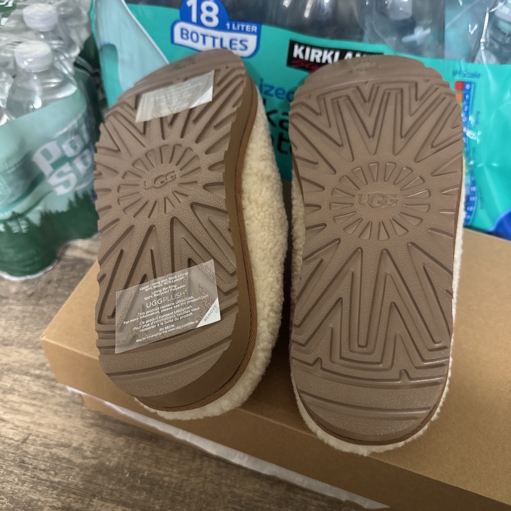 The UGG Australia Women's Tasman Maxi Curly Slippers in Natural are a luxurious and comfortable choice for women in size 7. These slip-on slippers feature a solid beige color with sheepskin lining for added warmth and softness. With a rubber outsole for traction, they are perfect for casual occasions in the winter and fall seasons. The UGG brand is known for its quality and style, making these slippers a stylish and practical addition to any woman's wardrobe.