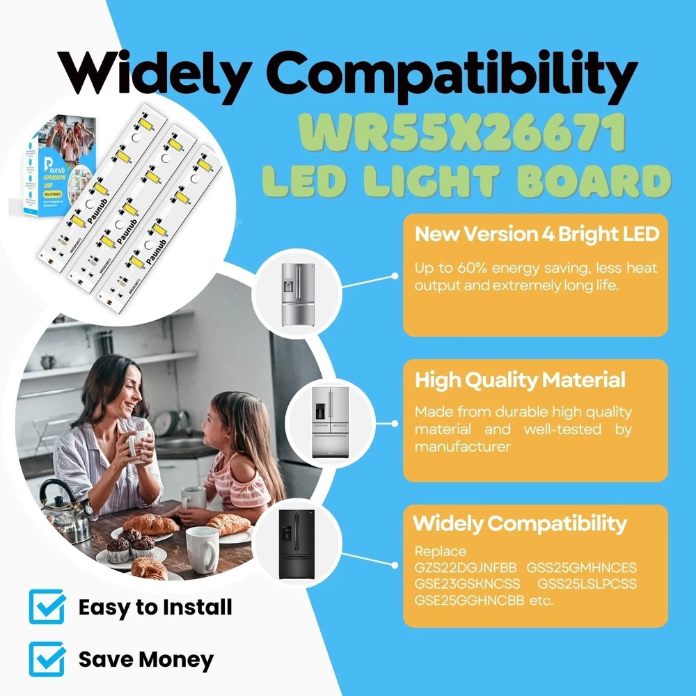 【New Version 4 Bright LED Chips GE Refrigerator Light 】WR55X26671 LED Light Bulb Refrigerators light bulb replacement energy saving and bright. Mainly used for repairing GE freezer refrigerator light bulb. Up to 60% energy saving, less heat output and extremely long life. Save $30 on your electricity bill per year, no longer need to replace frequently. 【Pack of 3 PCS for Money Saving 】GE Refrigerators Freezer Led Light Replacement Model: GSE25GGHJCCC GSE25GGHJCWW GSE25GSHJCSS GSE25HEMJHDS GSS25GMHJCES DSE25JGHGCBB DSE25JGHGCWW DSE25JMHGCES PSE25KBLJHTS PSE25KGHGHBB PSE25KGHGHWW PSE25KSHGHSS PSS28KSHGCSS PZS22MMKEHES PZS22MMKGHES PZS22MSKEHSS PZS22MSKGHSS GSS25GSHJCSS 【Compatible for GE Model Refrigerators 】WR55X26671 LED Light part is compatible with models including: 4468532 AP6035586 PS11767930 EAP11767930 CZS22MSKEHSS DSE25JGHECBB DSE25JGHECWW DSE25JMHECES DSE25JSHECSS PSE25KGHEHBB PSE25KGHEHWW PSE25KSHEHSS PSS28KSHECSS GSE25HGHJHBB GSE25HGHJHWW GSE25HMHJHES GSE25HSHJHSS CZS22MSKGHSS DSE25JBLJCTS DSE25JSHGCSS GSE23GGKJCBB GSE23GGKJCCC GSE23GGKJCWW GSE23GSKJCSS GSE25HBLJHTS GSS23GGKJCBB GSS23GGKJCWW 【Super Bright 7500K Daylight white Led Light】GZS22DGJNFBB GSS25GMHNCES GSE23GSKNCSS GSS25LSLPCSS GSE25GGHNCBB GSS23GGKNCBB GSE25GGHNCWW GSS25IGNBHWW GZS22IYNPHFS GSS25GGHNCWW GZS22IYNBHFS GSS25LSLNCSS GSS23GSKPCSS GSS25GMHPCES GSS25IBNBHTS XSS25GGHNCWW GSS25GGHPCBB CZS22MP2NBS1 GSE23GGKPCWW GSE23GSKPCSS