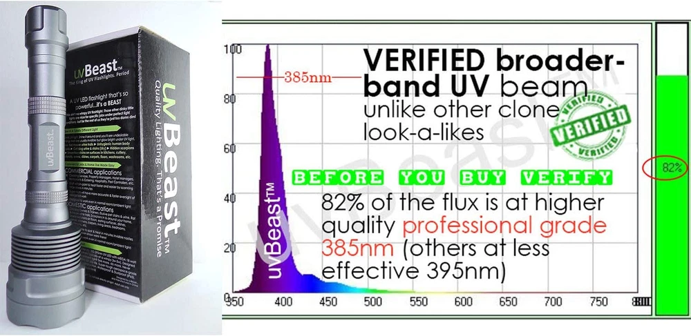 WHY uvBeast V3? It's the evolution from 100 LED models. (1) V3 WILL SAVE YOU BIG MONEY IN THE LONG RUN. No more stung by hidden running costs that hurt your pocket. (2) HIGHER UV INTENSITY THAN 100 LED. Delivered by massive TRIPLE 1.2A UV LEDs. (3) UNBEATABLE UV RANGE. Now the UV beam throw goes out to more than 70 feet. This is BIG LEAGUE YOU’LL MAKE BIG COST SAVINGS IN THE LONG RUN. uvBeast V3 does a re-configured power delivery system. Way more efficient than common 100 LED versions. A costly but necessary evil for that tech EVEN HIGHER UV INTENSITY THAN 100 LED VERSIONS. Flick the switch on the V3 and you’ll see the difference of the upgraded 3x SMD LEDs. It’s most noticeable in the throw of the UV beam. It’s long range out to 70 feet, which is more than twice that of 100 LED versions. We even successfully tested the fluorescence of UV ink out to 135 feet! This UV flashlight will NOT leave you wanting for more EVOLUTION FROM 100 LED. The 100 LED versions use the older DIP type LEDs (Dual Inline Package) encased in a bulb. There’s a limit to their UV output. We pushed that envelope with the V2. V3 now uses SMD tech to pump higher intensity UV delivered at 3.6 Amps (3x1.2A LEDs) – just when you thought that our 100 LED couldn’t get any more intense! READY TO MOVE INTO ULTIMATE UV FLASHLIGHT POWER? Our 100 LED totally impressed the market, and just when they thought it couldn’t get any better. Well here it is. With V3 you’ll be making the transition into biggest league UV. We continually test the V3 in the lab, in the field, and with a select bunch of testers/critics to provide a great fit for your needs Product Description THIS IS WHAT EVOLUTION FROM 100 LED UV LOOKS LIKE. THE ALL NEW V3 The uvBeast Brand uvBeast is a unique brand. We’re scientists (PhDs) and engineers (C.Eng) by background backed with years in industry. With an awesome reputation in both domestic and commercial markets, we don’t do “me too” product imitations. Instead we like to innovate and make a genuine difference. This really isn’t just another Black Light or UV Flashlight The uvBeast Pedigree Most sellers are standing still waiting for the next wholesale UV flashlight to be mass produced by factory xyz, marked up before onward to you. We're in a different game. We have our finger on your pulse and continually respond to user needs like yours. So we did the V3 uvBeast Market Adoption uvBeast currently serve commercial applications and industry sectors in NDT (Non-destructive Testing), Aviation, Oil & Gas, Automotive, Adhesive curing, Manufacturing, Hospitality, Fishing, Mining, Agriculture, Hygiene-level monitoring, and more. Everybody likes it when commercial-grade high power UV comes onto the domestic scene! The uvBeast V3 Formula Designed for longest-range & highest power applications Long range UV spot beam Adjusted wavelength specifically suited for many domestic & commercial uses Capable under interior/ambient lighting Complete control & line-of-sight of our entire supply chain from raw materials to manufacturing User-centered design NEW RELEASE: uvBeast V3. THE BIG POWER AND HIGHLY REGARDED UV FLASHLIGHT JUST GOT REVAMPED Since 2016 a lot of folks (and we mean a-lot) have told us they love the uvBeast, BUT please make a rechargeable one, they said. Why? The costs add up with the 100 LED versions. Every 12-14 hours of use you’ll need to fork out for another six AA alkaline batteries. But, folks have our 100 LED models in return for blindingly good UV! So, here’s our give-back to you WHAT’S NEW WITH V3 This is commercial-grade high power UV deployed in professional services, now making its way to you. Now it uses rechargeable 18650 Li-ion cells. BUT, that’s not all. Powered by Li-ion means BIG SMD LEDs, more UV intensity and much more UV range, and with the same uvBeast UV top-notch beam (385-395nm) you’ve come to expect from us. To say that it’s even better than our 100 LED models is really quite saying something. Do ask anyone SAVE HUGE COSTS WITH RECHARGEABLE 18650 LI-ION CELLS Let’s face it. You’re going to be owning an LED UV flashlight for years. Considered your total cost outlay for a 100 LED? You’ll need to fork out for a new set of six AA alkaline batteries every 12-14 hours of use. That’s quite a lot of dollars even over six months of use, let alone a single year WE NAILED IT We’ve already rolled this out to an early group of professionals and enthusiasts who are hard to please! Strong thumbs up, which means that you won’t be making a blind investment CLAIM TO FAME? Producing a mega power, high intensity UV beam isn’t easy for a handheld portable package. Especially a uvBeast top-notch UV beam, unbeatable throw range, and a Li-ion power source, into one flashlight! We wanted to make sure that you won’t find others like it V3 is the upgrade into higher intensity UV with a beam which will shock you. But yet low cost-of-ownership* *x2 rechargeable Li-ion cells give you the life of approx. 93 sets of x6 AA cells if you use the 100 LED versions. The V3 385-395nm has been nicknamed by users as the "UV Range Master". And there's a good reason for that WE DON'T IMITATE. WE INNOVATE A UV FLASHLIGHT WITH THE DRAWBACKS DESIGNED-OUT We don't spew out me-too UV flashlights. We do it different. We solve the user frustration first, then produce. User-centered design means we put user requirements at the heart of every design. Users want more power. Our R and D people are not sleeping. We're always upgrading and updating and we're absolutely obsessed in getting top performance into your hands We've been in the UV Flashlight business since 2016 when we launched our V1 model. V1 was a direct hit with users. Why? Because we talk when we must and shut up and listen when we need to. User-feedback goes straight into our design engineering The market is full of fly-by-night or non-expert sellers who often procure from dubious and non-verified sources. Cloned or copie