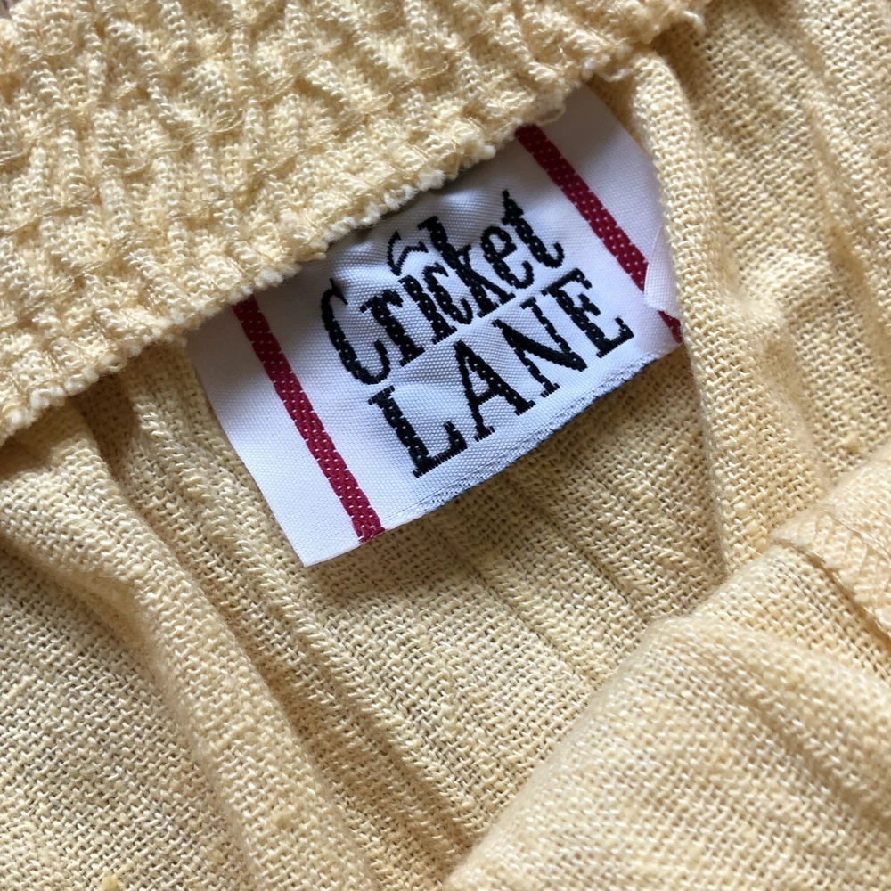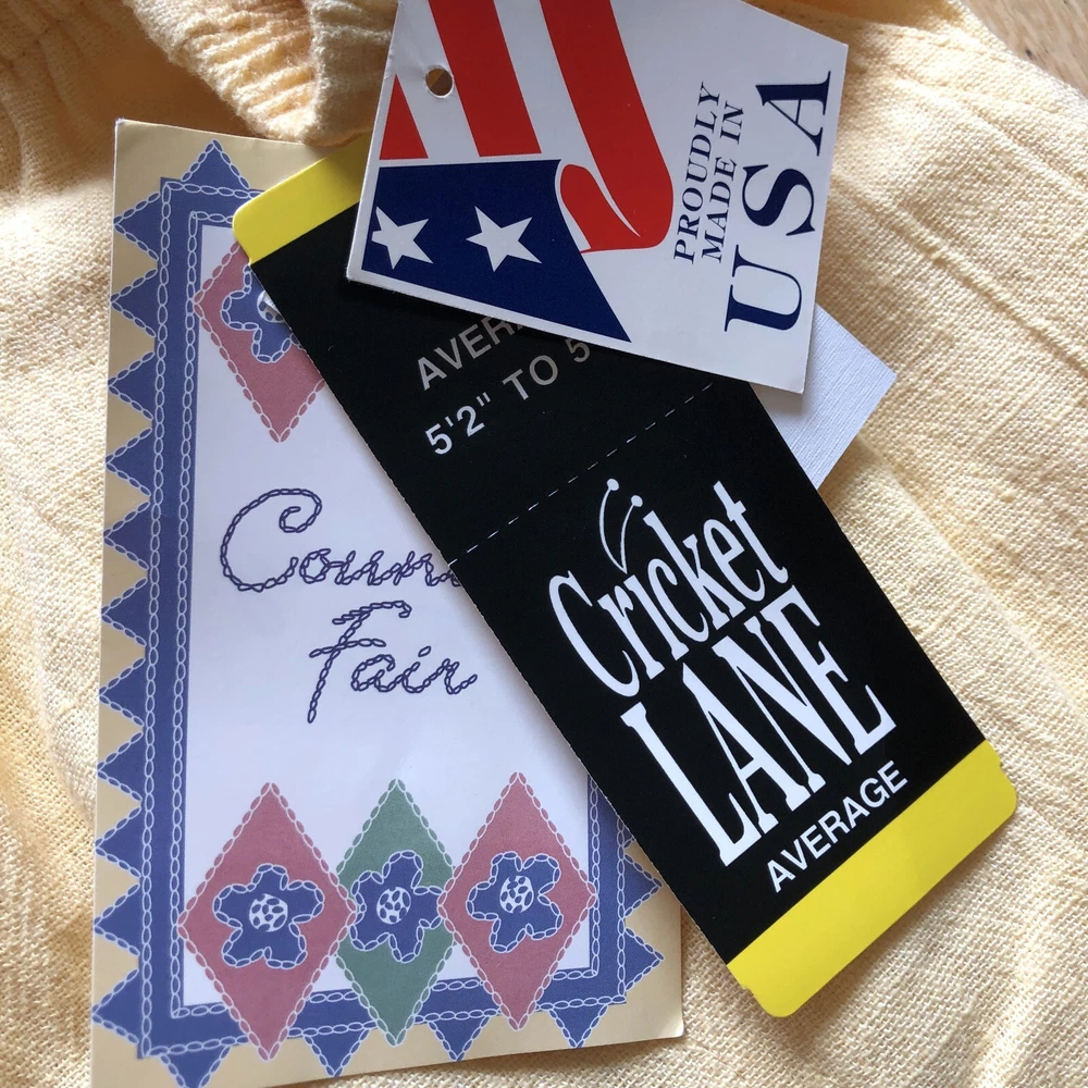 New with tags vintage Cricket Lane high waisted linen blend wide leg pull on pants in soft yellow. Elastic waist band, two front pockets. USA made. 50% cotton, 50% polyester. Approximate measurements waist 32 - 35, hip 45, rise 14, inseam 26.