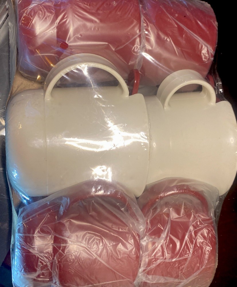 New USA Vintage Tupperware Coffee Serve Set 4 Mugs & 2 Condiment Caddy’s /factory sealed packaging. NOS Made in USA “Out of Production” Collectible Tupperware. Rare Color matching Set