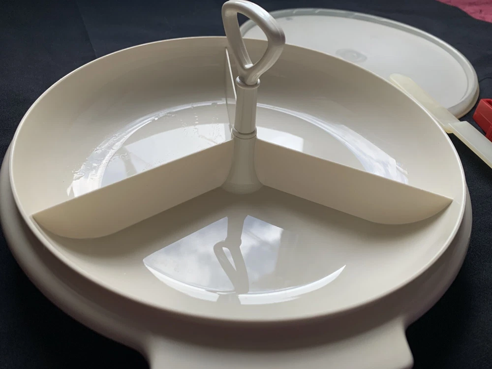 New vintage Tupperware. Comes with the dish, handle, lid, mini tongs and olive/onion spoon. Never used. Was part of my mother’s Tupperware salespersons kit. Kept in a closet for many years. Offers happily considered! Thanks for looking in Granny’s Shop🥰