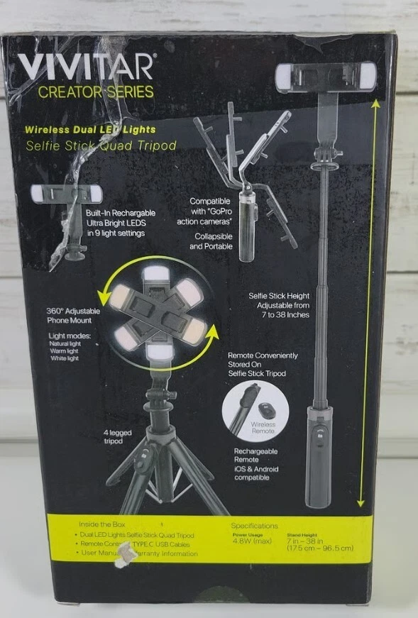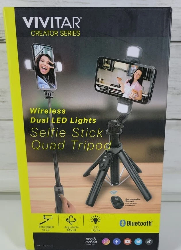 Capture the perfect selfie with this Vivitar 7-38" Selfie Stick & Quad Tripod set. The wireless remote allows for easy control of your camera and the matte black finish adds a sleek touch to your photography gear. Compatible with both IOS and Android devices, this selfie stick is a must-have for any avid photographer. The set includes a remote, selfie stick, and quad tripod, making it perfect for capturing the perfect shot from any angle. SKU#57