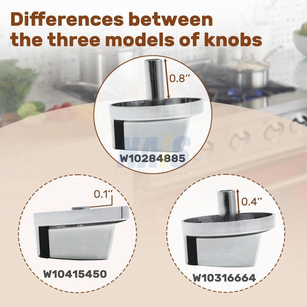 【Please note】 The stem length of the W10284885 is approximately 1 in. The W10284885 looks similar to the W10316664 and the W10415450, but their stem lengths are not the same, check the valve length of the knob you are purchasing before purchasing. 【Compatible Models】 Fits the following models: G7CG3064XS00, G7CG3064XB00, G7CG3665XS00, G7CG3665XB00, replacements part WPW10284885, W10284885, PS11752001, AP6018699, Note: Not applicable to W10316664 and W10415450. 【Higher quality】 W10284885 Knobs are made of high quality durable materials for ruggedness and long life. 【Easy to install】 No tools are needed, just remove the old knob and push in the new one. 【Peace of mind after sales】 If you have any questions about W10284885 Replacement Knob, please feel free to contact us, we will reply you within 24 hours and do our best to solve the problem for you. On Dec 1, 2025 at 11:01:34 PST, seller added the following information: