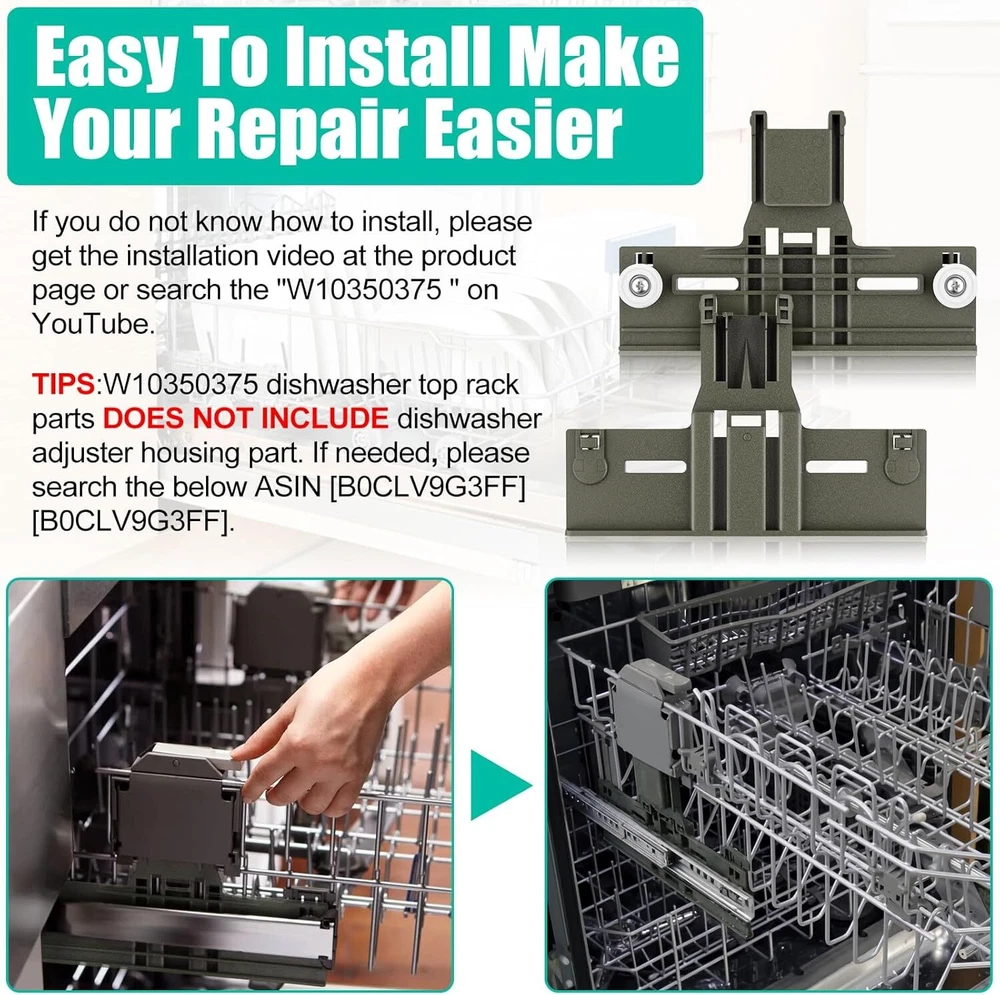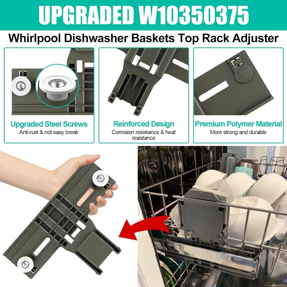 Glorious-2024 DESCRIPTION RETURN POLICY CONTACT US UPGRADED W10350375 Dishwasher Top Rack Adjuster Parts Replacement for Whirlpool Dishwasher Parts WDT730PAHZ0 WDT750SAHZ0 WDTA50SAHZ0 WDT970SAHZ0 Upper Rack Parts,Fits Kenmore Dishwasher Top Rack Parts Product Description: Condition: New Quality:100% Replacement and High Quality, Each Product is tested before shipping and are 100% working. Type: Dishwasher Dishrack Adjuster Part Number: 3516330 W10250159 W10712395 W10712395VP AP5957560 Material: Polymer Compatible Model: For Whirlpool W10350375 Compatible Brand: For Whirlpool About this item [Long-lasting Polymer Materia for Whirlpool Dishwasher Baskets Parts] Our W10350375 whirlpool dishwasher Baskets upper rack adjuster is made of upgraded high quality polymer material, which is more durable and corrosion resistance than other materials. And the wheels on the upper rack parts are held on via metal screws. These upgrades make dishwasher rack replacement more sturdy and durable, and will not easily melt and disintegrate due to normal use and heat. 【Perfect Dishwasher Replacement 】 ①W10350375 whirlpool dishwasher baskets parts replaces 3516330, W10250159,W10712395, W10712395VP, AP5957560, PS10065979, W10712395VP. ② W10195840 Dishwasher Positioner Replaces1872228, AH3407016, EA3407016,etc. ③ W10195839 Dishwasher Rack Adjuster Replaces: WPW10195839, AP6016799, PS11750092. ④ W10508950 Dishwasher Stop Track Replaces: 8562015, W10199682, 2684662, AP6022472, PS11755805,etc ⑤W10250160 dishwasher adjuster arm clip lock replaces WPW10250160, AP6017800, PS11751100. 【Great Compatibility, Fit Like the Original】 W10350375 Dishwasher baskets top rack parts adjuster kit Compatible with Whirlpool, KitchenAid, Kenmore and others dishwasher replacement rack models. Fits following dishwasher model: WDT730PAHZ0, WDT750SAHZ0, WDTA50SAHZ0, WDT730PAHZ0, WDT780SAEM2, WDT970SAHZ0, WDT780SAEM1665.12763K313, 665.13409N413, 665.14703N511, 665.14542N711, 665.14529N611, 665.14569N610, KDFE454CSS4, KUDC10IBSS0, KUDC10FBWH0, KUDE20FBWH0, KUDC10IBBL0, KUDE20FBBL1, KUDE20FBSS0, etc. 【Easy Installation-Perfect Dishwasher Parts】 These W10350375 dishwasher baskets parts whirlpool top rack replacement adjuster kit are able to fixes symptoms: ①dishwasher not washing properly; ②dishrack will not pull out or push in; ③dishrack is not level;④upper dish rack cant fix and other etc.Item is easy to remove and replace,search for "W10350375" on the YouTube to get the installation video and it shows you exactly how to installation. 【Package & Warranty】 Package Contents: 2 x W10350375 Dishwasher Baskets Upper Rack Adjusters, 2 x W10195840 Dishwasher Positioners,2 x W10195839 Rack Adjusters,2 x W10508950 Stop Tracks. 2 x W10250160 Dishwasher Baskets Adjuster Arm Clip-lock. 2 x Placemats. This dishwasher baskets adjuster kit not include dishwashing adjuster housing. If you want purchse the Dishwasher Dishrack Adjuster Housing, please search the below ASIN[B0CLV9G3FF] [B0CLV9G3FF]. 1-Year Guarantee--Please contact us at any time if the there is any problem in the product, damaged or not fit. We provide full after-sales service and will try our best to solve the problem. [Compatible with Kenmore Dishwasher Top Rack Models] Luckman's upgraded w10350375 dishwasher top rack adjuster fit Kenmore dishwasher top rack parts model 665.13209N410, 665 13209n412, 665.13223n412, 665.13223n413, 665.13269k112, 665.13269K113, 665.13269k114, 665.13542N410, 665.13542n412, 665.13543n410, 665.13543n410 , 665.13543n412, 665.13693n411, 665.14573n612, 665.14759n512; Fit KitchenAid dishwasher parts upper rack models KDFE454CSS2, KDFE454CSS3, KDFE454CSS4, KDFE454CSS5, KUDC10FBBL0, KUDC10FBSS0, KUDC10FBWH0, KUDC10IBBL0, KUDC10IBSS0, KUDC10IBWH0, KUDE20FBBL0, KUDE20FBSS0, KUDE20FBWH0. Dishwasher Baskets Top Rack Replacement Parts NumberW10350375 Replaces Part Numbers: W10350375 , W10250159 , W10712395 , W10712395VP,AP5957560,PS10065979,W10712395VP. W10195840 Dishwasher Positioner Replaces Part Numbers: 1872228, AH3407016, EA3407016, PS3407016, WPW10195840, LP16233. W10195839 Dishwasher Rack Adjuster Replaces Part Numbers: WPW10195839, AP6016799, PS11750092. W10508950 Dishwasher Stop Track Replaces Part Numbers : W10508950, 8562015, W10199682, 2684662, AP6022472, PS11755805, EAP11755805, PD00004770.W10250160 dishwasher adjuster arm clip lock replaces : WPW10250160,AP6017800,PS11751100. Compatible with Whirlpool Dishwasher Model: 7WDT950SAYM0 7WDT950SAYM1 7WDT950SAYM2 7WDT950SAYM3 WDF590SAJB0 WDF590SAJM0 WDF590SAJW0 WDT730PAHB0 WDT730PAHV0 WDT730PAHW0 WDT730PAHZ0 WDT750SAHW0 WDT750SAHZ0 WDT780SAEM0 WDT780SAEM1 WDT780SAEM2 WDT790SLYB0 WDT790SLYM0 WDT790SLYM1 WDT790SLYM2 WDT790SLYM3 WDT790SLYW0 WDT790SLYW2 WDT910SAYE0 WDT910SAYE1 WDT910SAYE2 WDT910SAYE3 WDT910SAYH0 WDT910SAYH1 WDT910SAYH2 WDT910SAYH3 WDT910SAYM0 WDT910SAYM1 WDT910SAYM2 WDT910SAYM3 WDT910SSYB0 WDT910SSYB1 WDT910SSYB2 WDT910SSYB3 WDT910SSYM0 WDT910SSYM1 WDT910SSYM2 WDT910SSYM3 WDT910SSYW0 WDT910SSYW1 WDT910SSYW2 WDT910SSYW3 WDT970SAHB0 WDT970SAHV0 WDT970SAHW0 WDT970SAHZ0 WDT975SAHV0 WDT975SAHZ0 WDTA50SAHB0 WDTA50SAHN0 WDTA50SAHZ0 WDTA75SAHN0 WDTA75SAHZ0 Compatible with Kenmore Dishwasher Model: 221.3222N414 221.3223N414 221.3229N414 221.4523N611 221.4545N711 221.4573N612 221.4743N513665.12762K312 665.12762K313 665.12762K314 665.12763K312 665.12763K313 665.12763K314 665.12769K312 665.12769K313 665.12769K314 665.12772K312 665.12772K313 665.12772K314 665.12773K312 665.12773K313 665.12773K314 665.12774K312 665.12774K313 665.12774K314 665.12776K312 665.12776K314 665.12776K315 665.12779K312 665.12779K313 665.12779K314 665.12813K313 665.13042K110 665.13043K110 665.13044K110 665.13049K110 665.13202N410 665.13202N411 665.13202N412 665.13202N413 665.13203N410 665.13203N411 665.13203N412 665.13203N413 665.13204N410 665.13204N411 665.13204N412 665.13204N413 665.13209N410 665.13209N411 665.13209N412 665.13209N413 665.13222N410 665.13222N411 665.13222N412 665.13222N413 665.13222N414 665