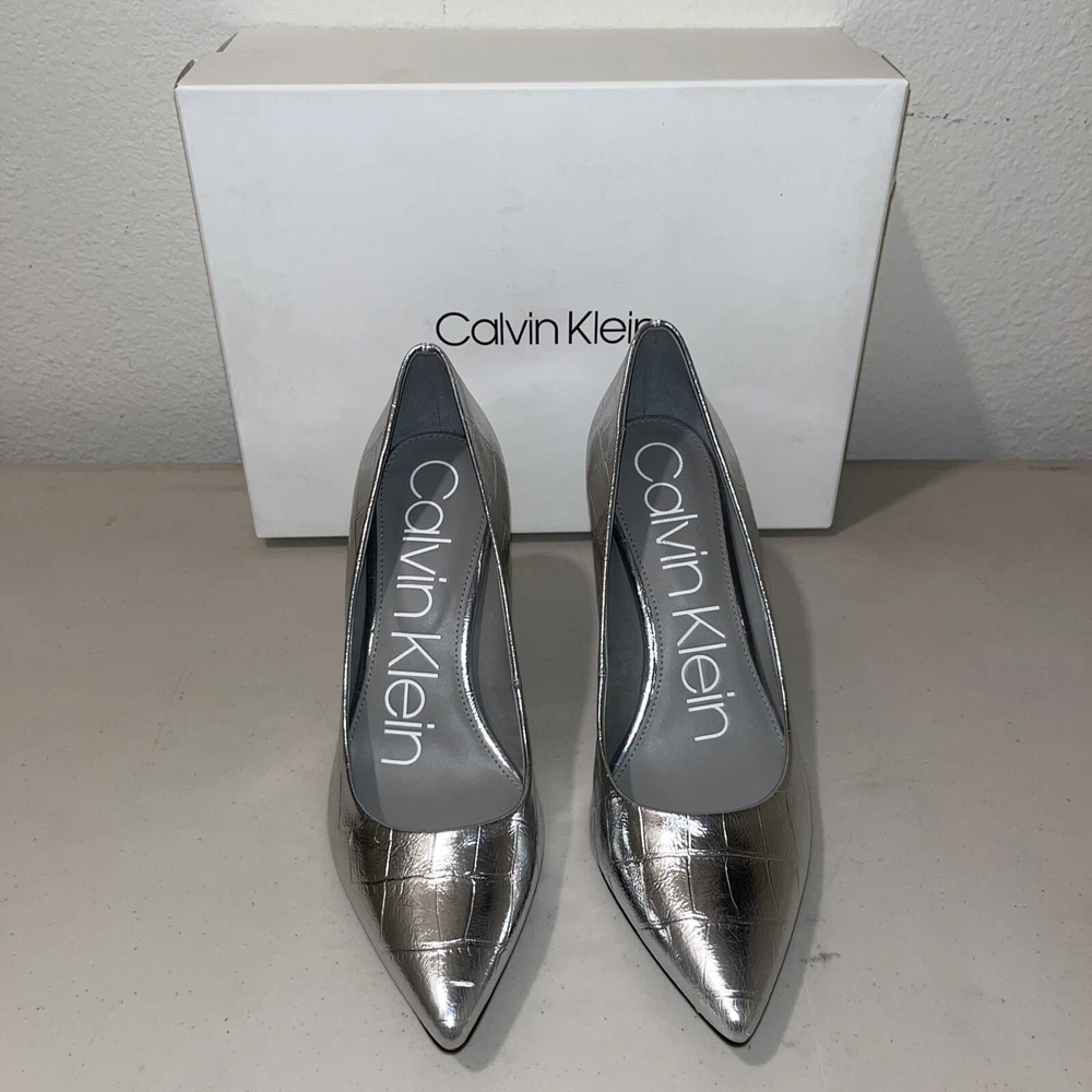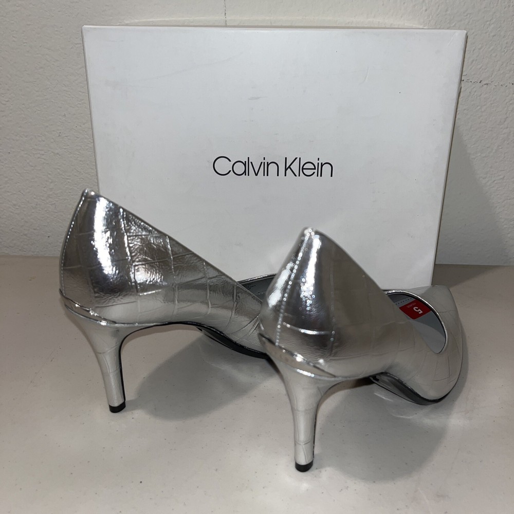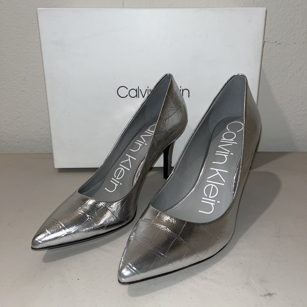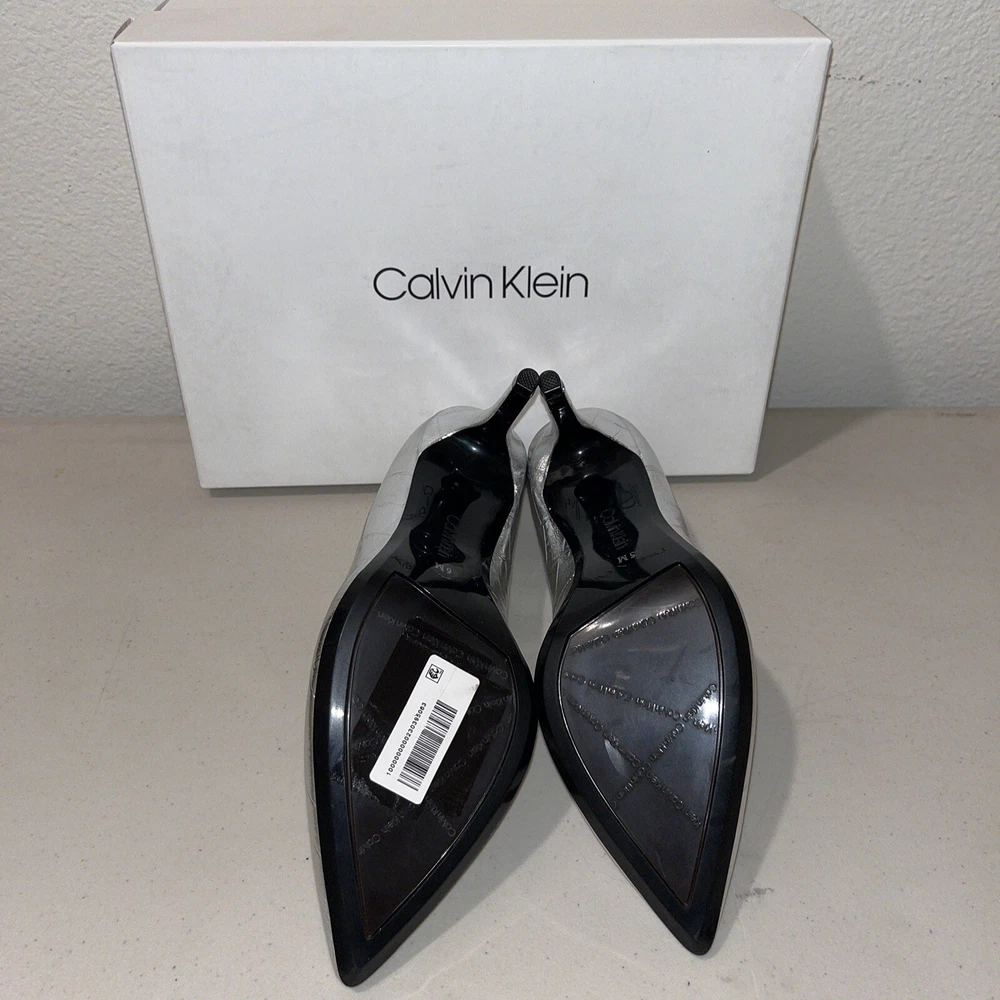 New W/box CALVIN KLEIN Women Silver Croc Gel Pod Gayle Stiletto Slip On Pumps 6M is in excellent new condition but is a little bit dirty (is not a scratch) looks like is a water paint but I don’t want to put any liquid solution on it because I don’t know if the shoe paint will be ok please check the pictures carefully for better look No returns refund or cancel orders sold as is thanks