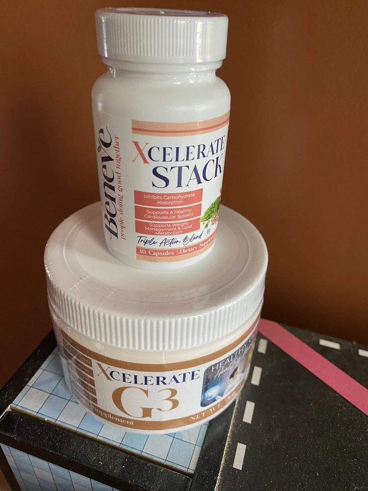Wellness Duo G3 - 30 SERVINGS | STACK 3 - 30 SERVINGS The Perfect Blend for Weight Management Our “Wellness Duo” is a powerful combination of two premium products (G3 & Stack 3), that work synergistically to enhance your overall well-being and weight management. Formulated with trademarked and patent-pending ingredients, this product duo is designed to address your body's diverse gut health needs, while naturally supporting your body’s GLP-1 & Serotonin production ( 90% of total body Serotonin is produced in the gut ). We designed this product Duo to quite literally be the Holy Grail for optimal gut health and unparalleled weight management. Products Included in Your Duo : G3 - Holy Grail for Optimal Gut Health: G3 supports the gut-brain axis, the bidirectional communication between your gut and brain. A healthy gut can influence mood, stress levels, and cognitive function, contributing to overall mental well-being. W ith its unique blend of colostrum (ethically sourced/grass-fed), prebiotics (inulin), probiotics (yogurt cultures), and postbiotics (BIOMEnd™ - The Superior Butyrate™). This powerful combination surpasses other digestive support products in many important ways, particularly with its inclusion of postbiotics—a crucial component often missing in other so-called gut health products. Embrace a revitalized you with G3, the key to a happier, healthier gut!" Colostrum (Ethically Sourced/Grass-Fed) Prebiotics Inulin Probiotic Yogurt Cultures Postbiotics - BIOMEnd™ - The Superior Butyrate™ * As BIOMEnd™ is a Best-in-Class Butyrate formulation, one would expect a very strong scent; however, we have successfully masked 97% of the Butyrate aroma with a mint & vanilla flavoring combination. The amazing results that your body will receive ( gut/brain axis bidirectional communication ) from BioMend Butyrate are certainly worth the slight scent you’ll notice while handling. A healthy gut can have a significant impact on influencing mood, stress levels, and cognitive function, contributing to your overall mental and physical well-being Stack 3 - Natural Path to a Slimmer You: Embark on your weight management journey with confidence and ease. Xcelerate Stack 3 is designed to support your natural GLP-1 production to assist you in achieving your health and wellness goals. Whether you're looking to shed a few pounds, maintain a healthy weight, or simply improve your overall well-being, Stack 3 is here to help. Take control of your health and embrace a brighter, healthier future. The one thing we know for sure, this product will change your relationship with food! Gymnema Sylvestre Momordica Charantia Actazin™ Ceylon Cinnamon Purchased from a friend and got on a smartship this is new and never used