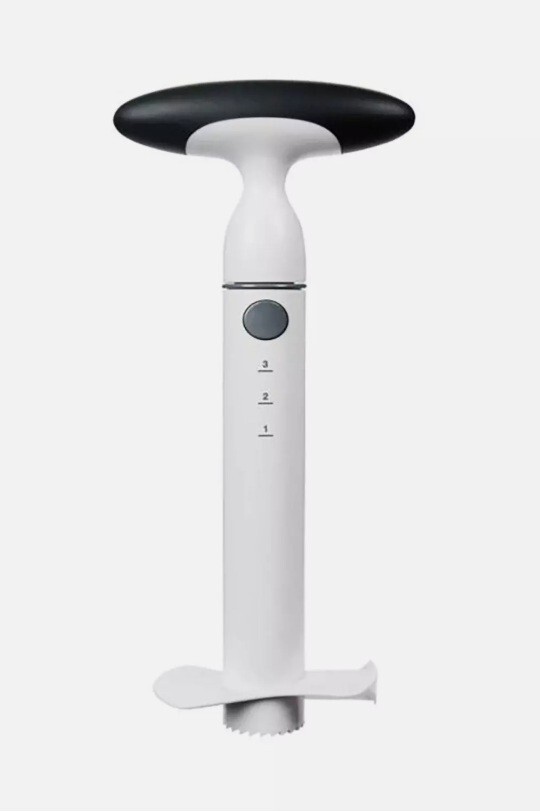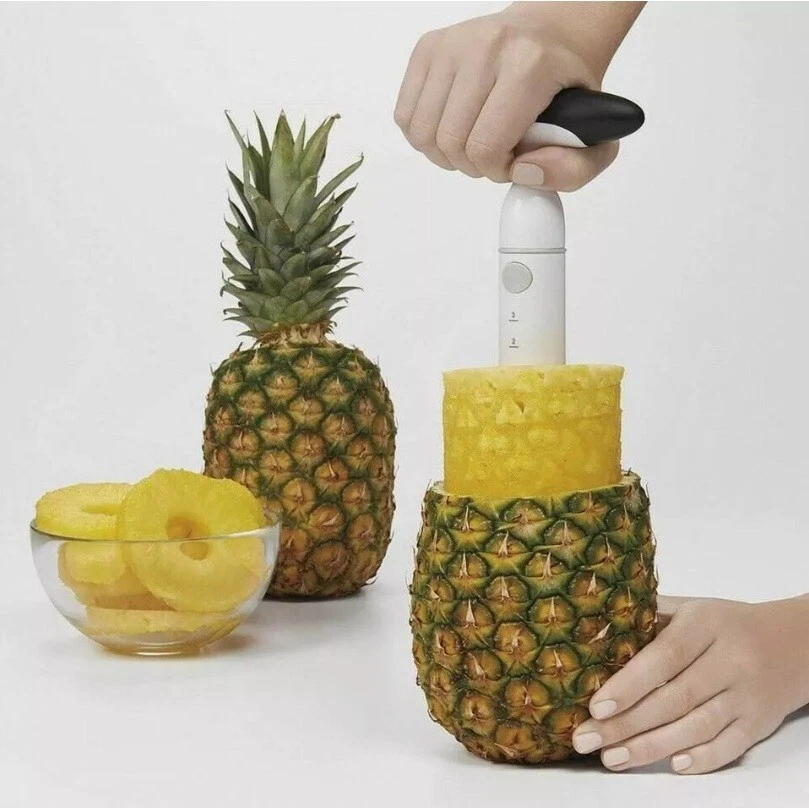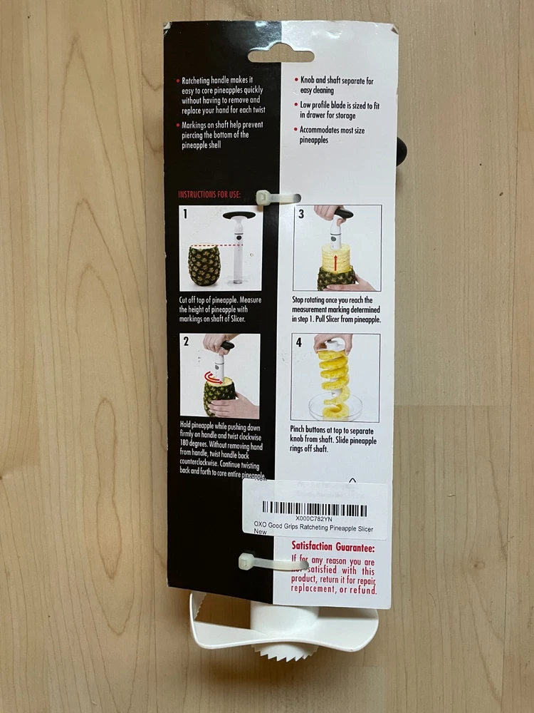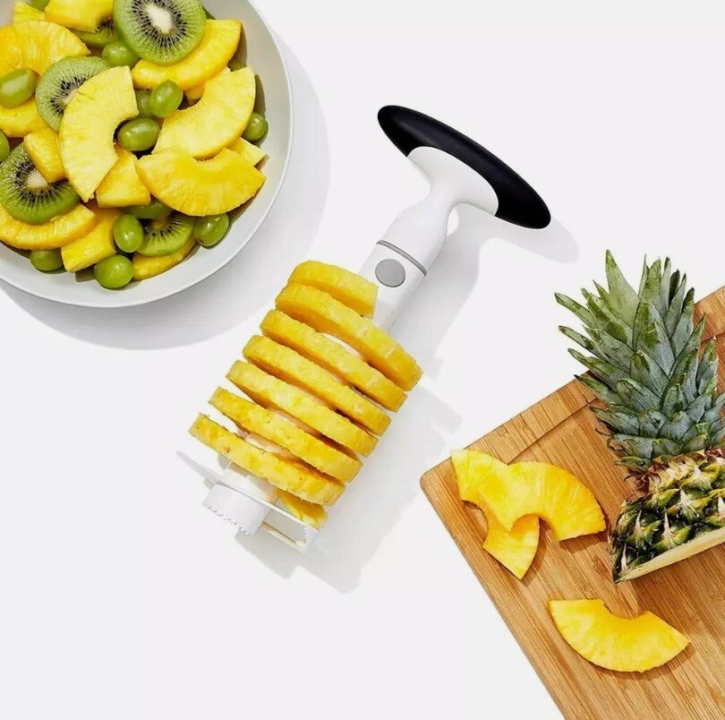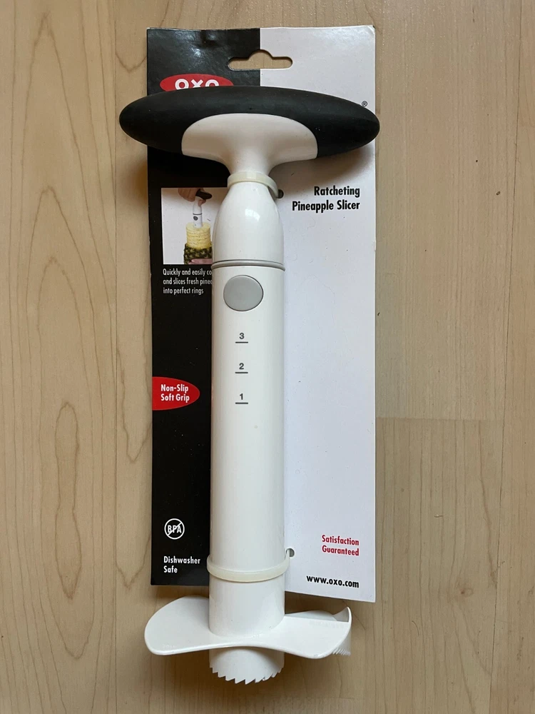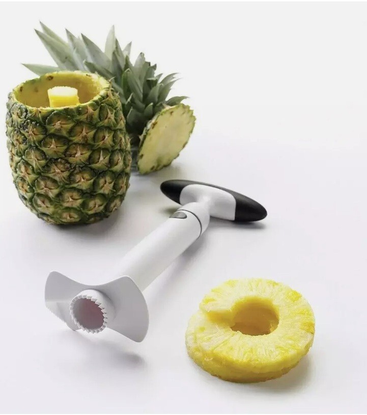 The OXO Good Grips Ratcheting Pineapple Slicer is a great tool to use to slice up pineapple quickly & safely. Simply slice off the top of a fresh pineapple, then twist the Slicer onto the exposed fruit to create perfect pineapple rings. The ergonomic Ratcheting handle is easy on arms & wrists. Measurement markings let you gauge a pineapple's height before slicing so you know when you're nearing the bottom of the fruit. For more than three decades, OXO has made tools that delight & exceed expectations, making OXO a favourite for a generation. Dimensions: L30.4 x W12 x H4.4cm Colour: White with Black & Grey trim BPA free Measurement markings let you gauge a pineapple's height E rgonomic Ratcheting handle is easy on arms & wrists Non-slip grip Adjustable height for different sized pineapples Dishwasher safe First 5 are stock photos; last 2 are photos of actual item