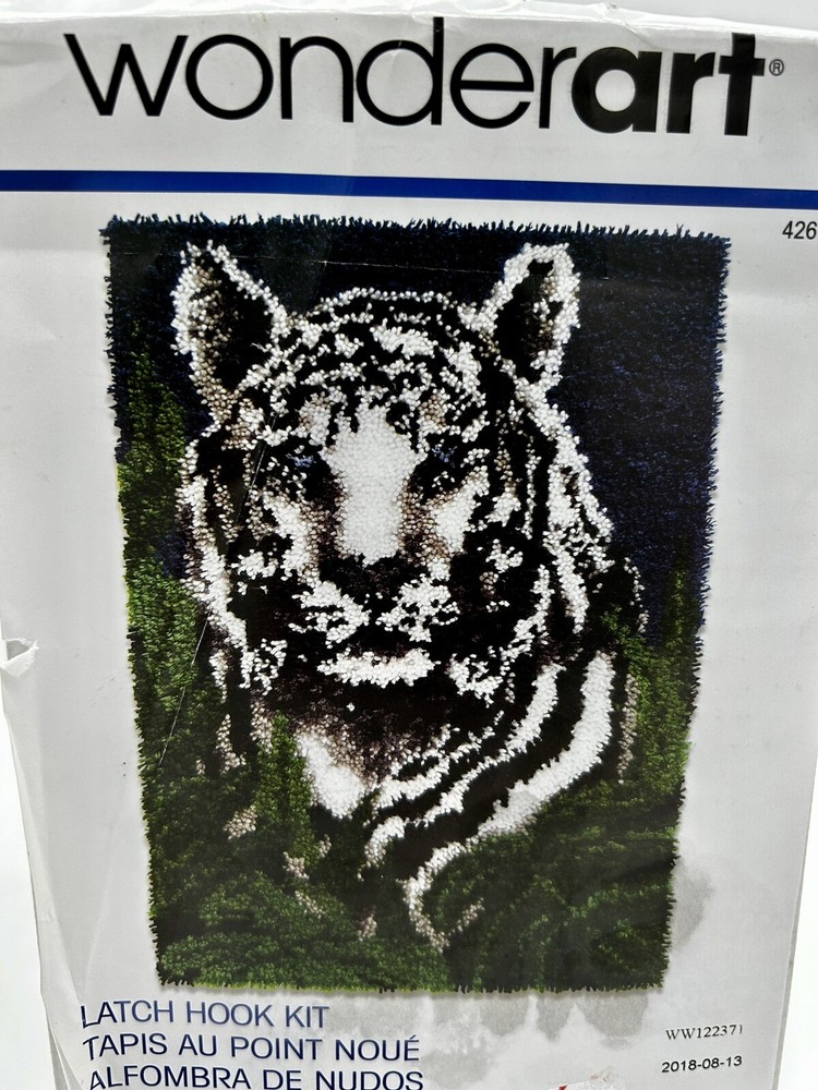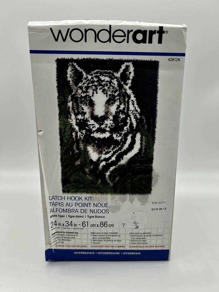 WonderArt® White Tiger Latch Hook Kit. Never used in original package- package is a little worn from storage. 100% acrylic This kit contains a 50% polyester/50% cotton canvas pre-cut rug yarn. Hook tool and binding materials are not included. Finished this will make a great accent rug- and the neutral colors will fit nicely in any decor. 3/55/5/23