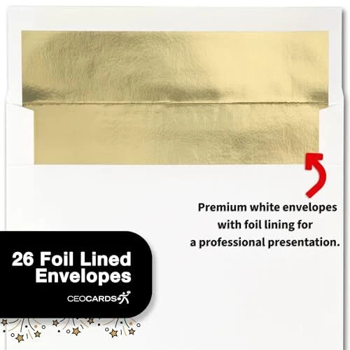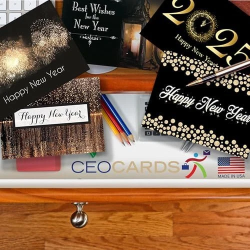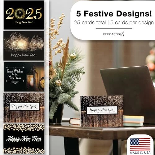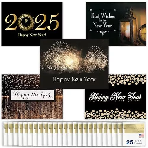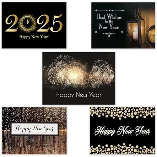 Return Policy Fast Delivery Trusted seller New Years Cards for Business & Family (Variety Pack - Gold) Bulk Greeting Card Set Pack of 25 Happy New Year Cards with Envelopes for 2025 (5x7 inch) Great for Office, Work Employees & Clients VP1505 Product Description NEW YEAR’S VARIETY CARD SET: This professionally designed card set contains twenty-five (25) new year holiday greeting cards. Contains an assortment of 5 unique seasonal card designs (5 cards per design). This set also includes twenty-six (26) premium white envelopes with gold foil lining, which are perfect for both business and personal contacts! CARD SIZE: These happy new year holiday seasonal cards are 15pt gloss coated stock with an aqueous coating to give the greeting cards a nice shine. Festive seasonal greeting cards are 5" x 7" and are printed in full color. PRE-PRINTED MESSAGES: Each New Year’s greeting card has a special pre-printed verse inside, which can be viewed by ing on the product images on this listing. Ideal for coworkers, clients, employees, family, friends, teacher gifts and more! NO SMUDGING: The inside of each holiday card is uncoated to reduce pen smearing & smudging, allowing you to add your own personal message of thanks and appreciation. MADE IN USA: Our bulk new year celebration seasonal greeting card sets include all original designs and do not include glitter, embossing or foil stamping. All of our greeting cards are made in North Carolina, USA! Shipping Returns Payment Shipping Shipping is FREE to all addresses other than APO/PO boxes in the lower 48 states. All our stock ships from US-based warehouses. Shipped via USPS or UPS (depending on location and package weight) Unless stated otherwise, all orders will ship within 24-72 hours of your payment being processed. Check our feedback to see the great reviews of FAST shipping we offer. Returns Seller does not accept returns Payment We currently accept payment via eBay managed payments only. Once payment is cleared, we will dispatch your shipment within 1-3 business days. Please refer to the "Shipping" tab for more information regarding shipping speed to your destination.