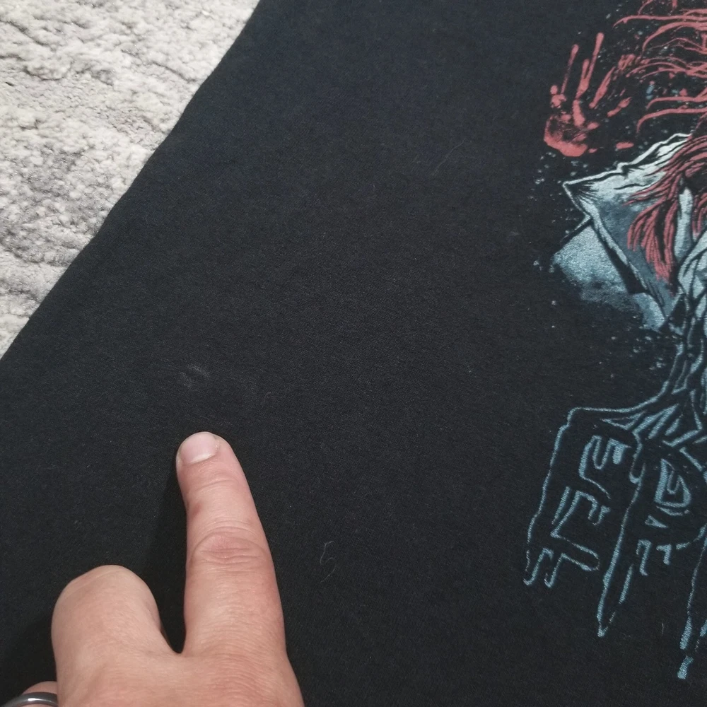 Sleeve Length:Short SleeveGraphic Print:YesCharacter Family:MetalPersonalize:NoHandmade:NoCountry/Region of Manufacture:Dominican RepublicBrand:UnknownVintage:NoSize Type:RegularFabric Type:KnitFit:RegularColor:BlackPattern:SolidTheme:Metal, Hard Rock, Goth Rock, Nu MetalSize:LNeckline:Crew NeckType:T-ShirtFeatures:PreshrunkCharacter:New Years DayMaterial:CottonAccents:LogoDepartment:Men