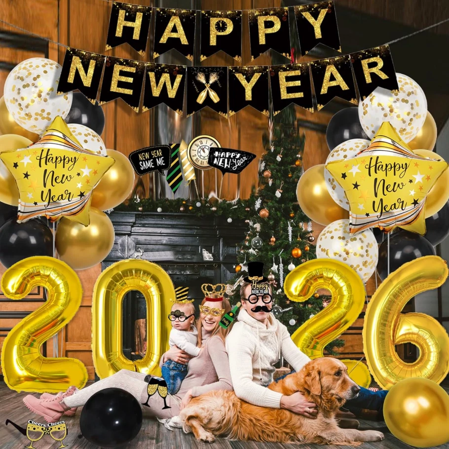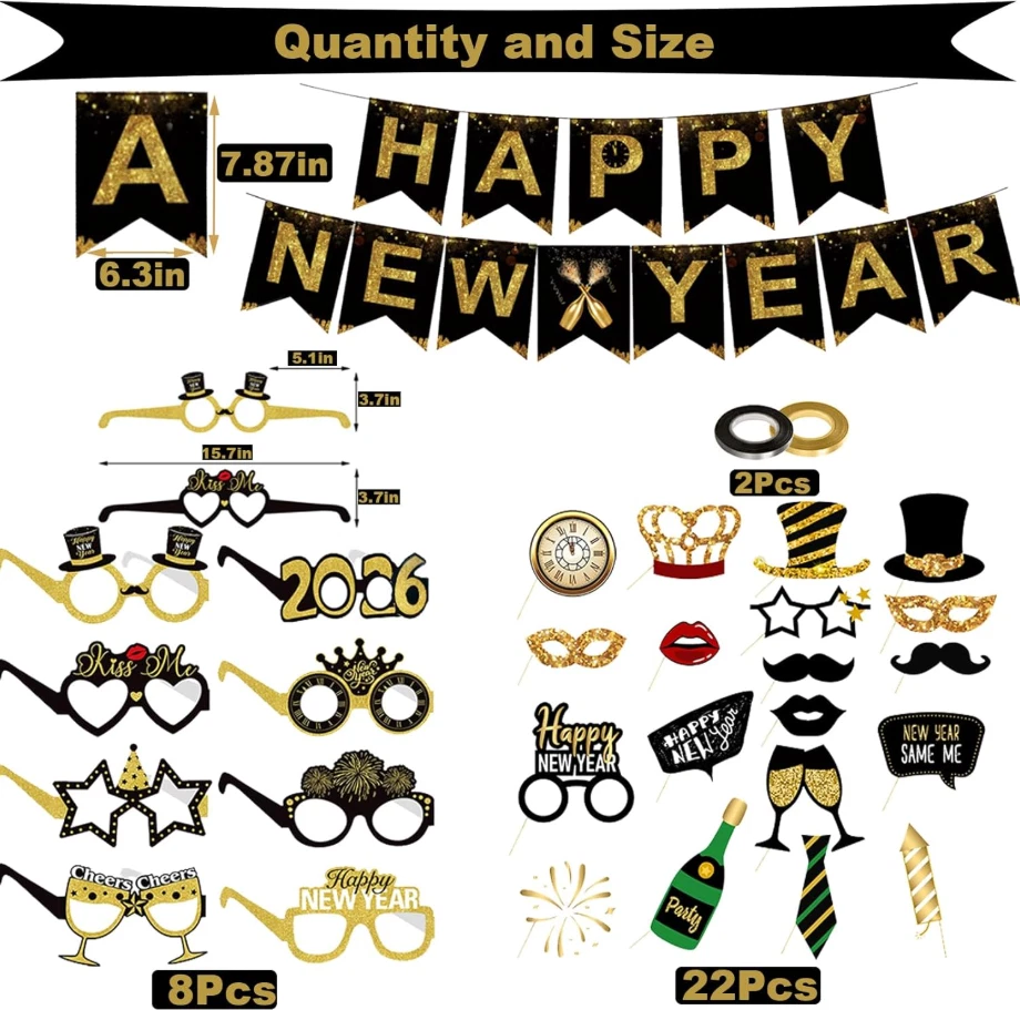 2026 Happy New Years Decorations Set Celebrate the arrival of the new year in unforgettable style with our complete 2026 New Year’s Eve party supplies set . This all-in-one kit includes 1 × gold and black “HAPPY NEW YEAR” banner , 2 pcs 18-inch golden pentagram aluminum foil balloons , 4 pcs 32-inch gold number balloons “2026” , 8 pcs New Year’s Eve party glasses , 22 pcs 2026 New Year photography props , 6 pcs 12-inch metallic gold balloons , 6 pcs 12-inch black balloons , 6 pcs 12-inch gold confetti balloons , plus one gold ribbon and one black ribbon . Every element is carefully selected to create a luxurious, festive, and joyful atmosphere , ensuring these New Year’s Eve party supplies 2026 bring smiles, excitement, and unforgettable moments to your celebration. Applicable Occasions These 2026 New Year decorations are ideal for New Year’s Eve parties 2026 , New Year celebrations , New Year’s Eve carnivals , and anniversary parties . Designed for both indoor and outdoor use , the Happy New Year balloons and banner easily enhance living rooms, party halls, offices, shops, and outdoor venues. Whether you are hosting a small family gathering or a large party, these New Year’s Eve balloons party supplies add fun and elegance to any special occasion. Reusable and Sturdy Our Happy New Year decorations are made from high-quality natural latex and premium aluminum mylar foil , making them durable, sturdy, and not easy to burst . All materials are non-toxic, safe to use, and certified , ensuring reliable quality. The reusable Happy New Year banner 2026 and foil balloons are designed for long-term use, allowing you to enjoy them again while maintaining their shine and structure. Unforgettable Memory This beautiful Happy New Year banner 2026 creates a sparkling and elegant decorative style for your New Year’s decorations 2026 . The classic black and gold color combination delivers a luxurious, eye-catching look that enhances the festive atmosphere and provides a perfect backdrop for photos, helping you create lasting memories as you welcome the new year. Confident Choice We are confident in the quality, durability, and design of our black and gold Happy New Year banner 2026 and matching decorations. The rich colors and premium materials ensure your New Year’s sign and balloons shine throughout the entire celebration. If these 2026 New Year decorations do not meet your expectations, support is available. Transform your Happy New Year decorations 2026 into a stylish and memorable celebration with this complete party décor set.