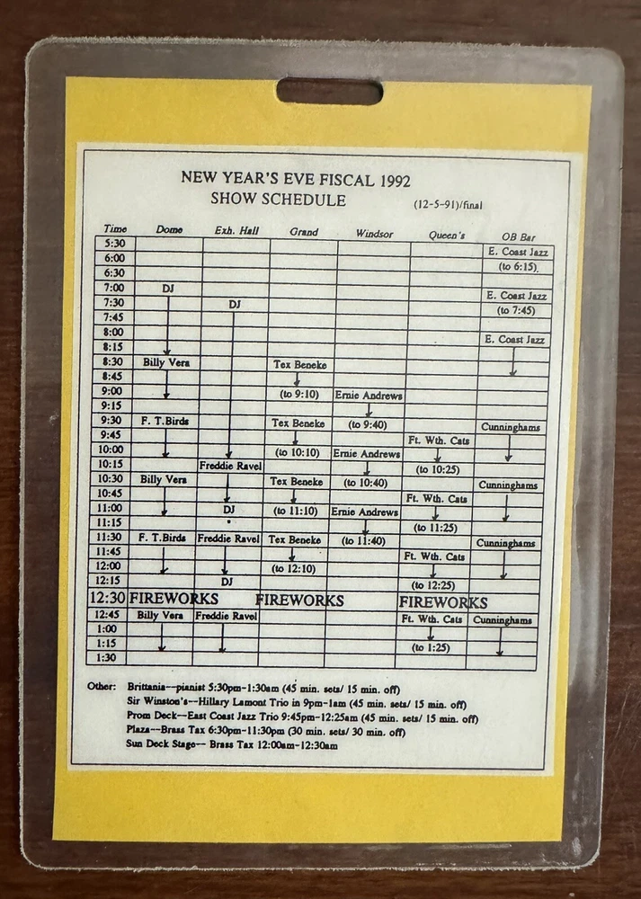 This laminated pass is a must-have for any music enthusiast. It features multiple acts performed onboard the Queen Mary during New Years Eve 1991. The pass is an original piece and a rare find for collectors of music memorabilia.