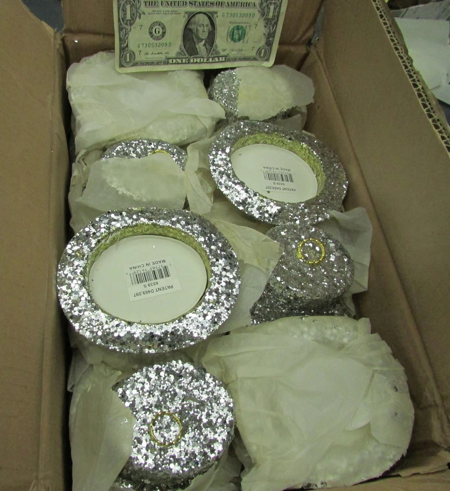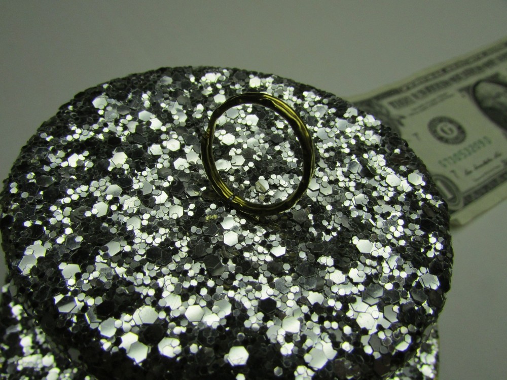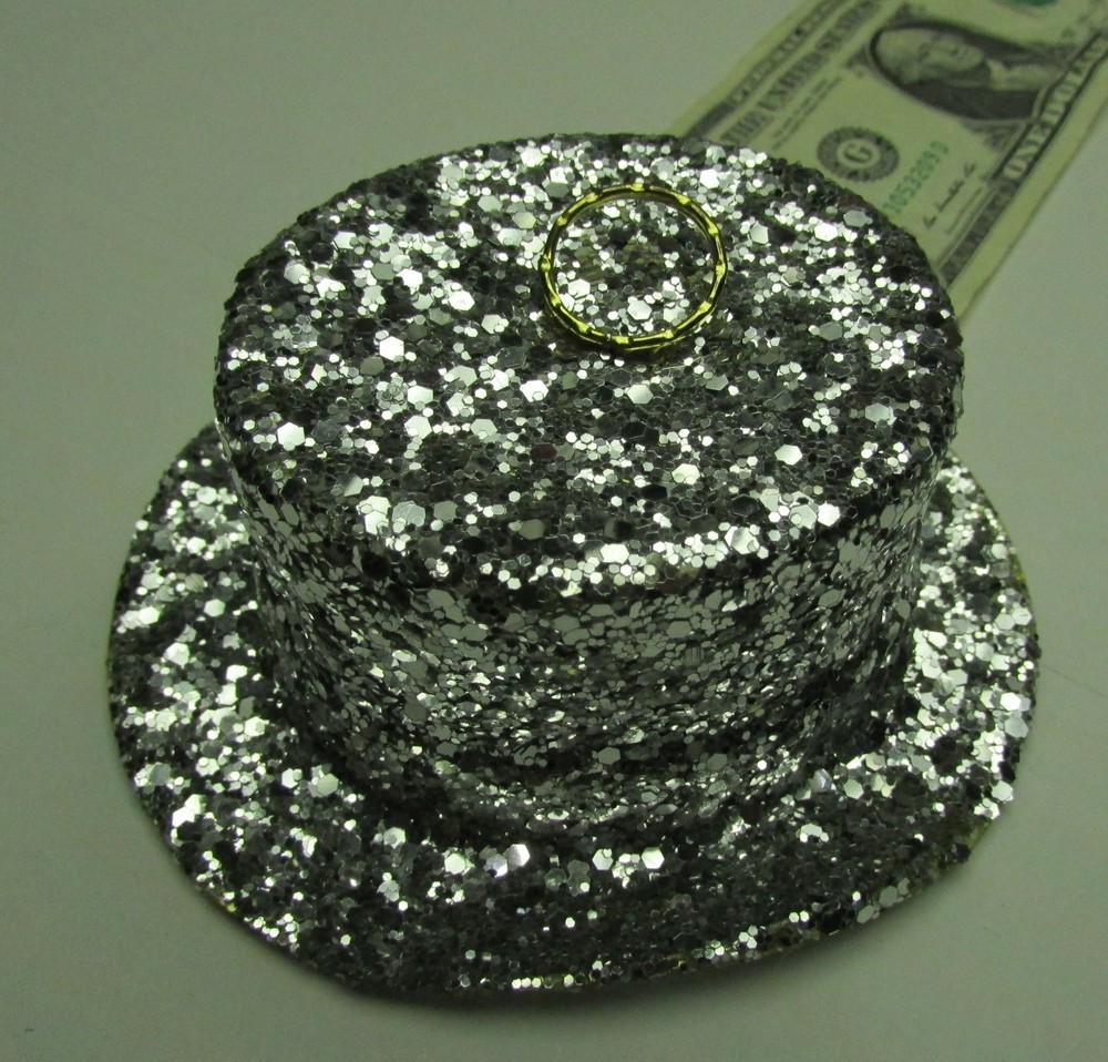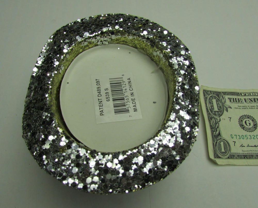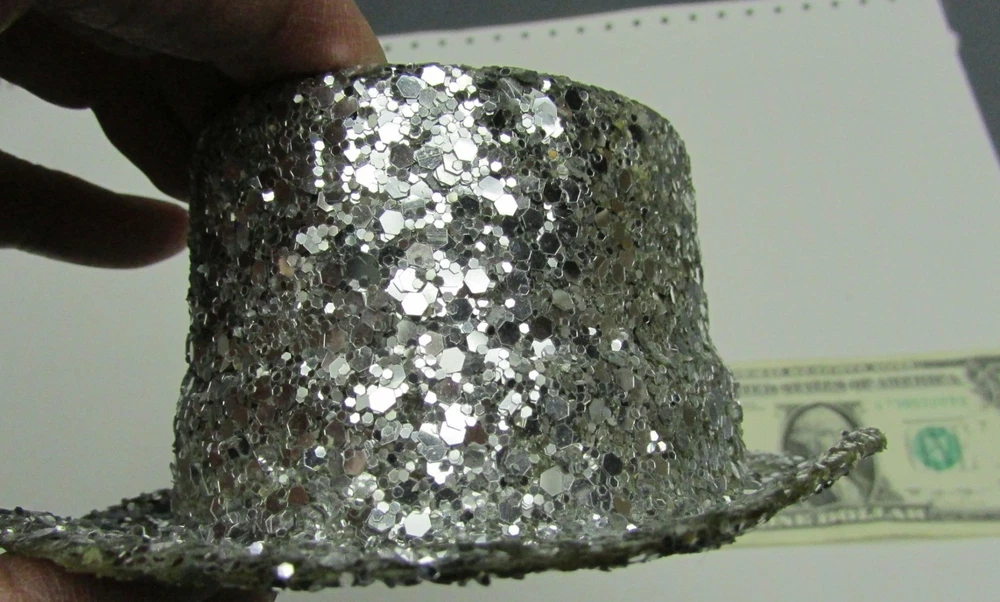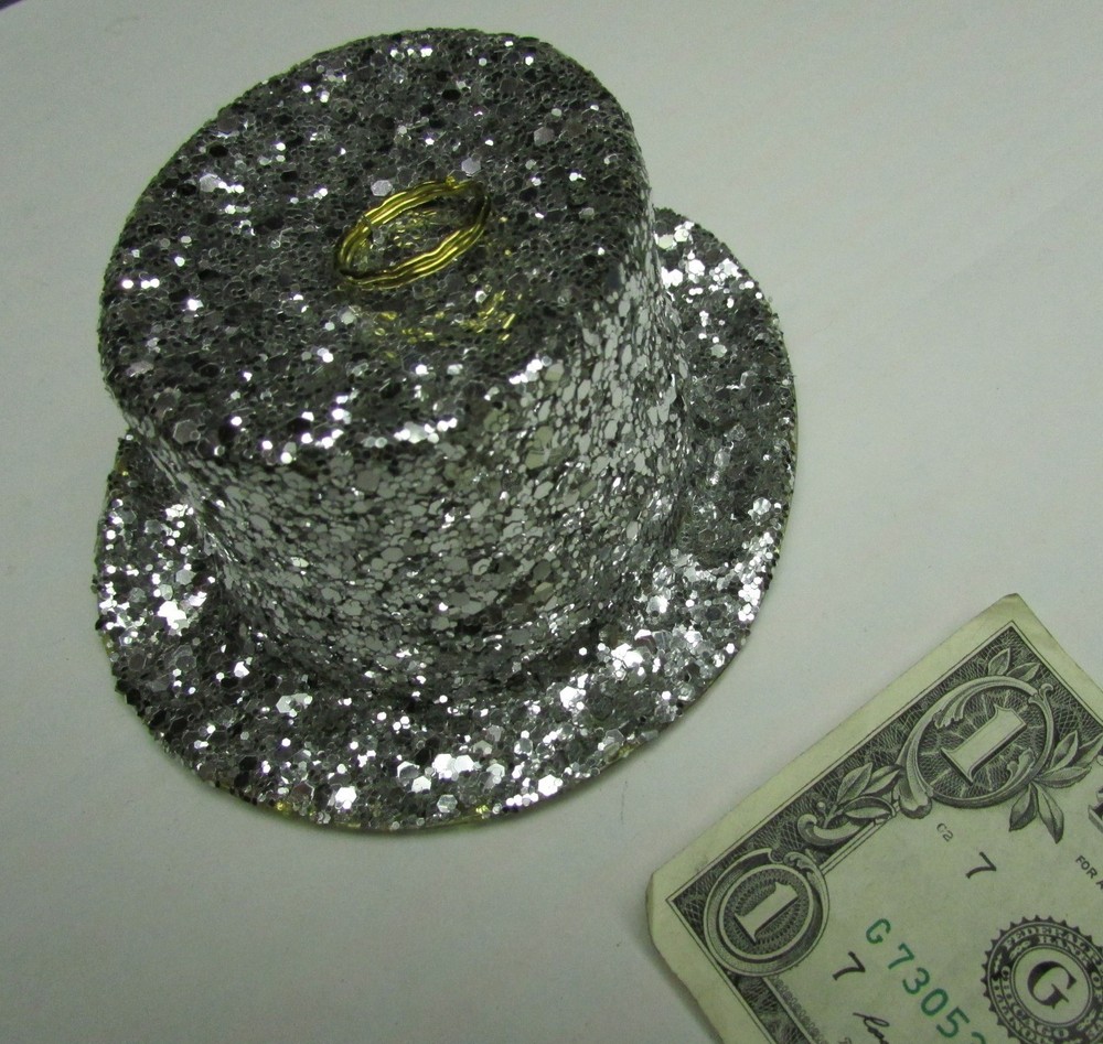 5147SE6E.55 New Years Eve 5" x 2" Sparkle Glitter Party Hat Table Decoration, Christmas Tree Ornaments, Part Number 6539-S. Each bid quantity is for One (1) Hat. You may bid / buy any number, up to the total quantity available above. These were purchased at a lost freight sale years ago, and they were brand new in the original factory box. They weigh over a half pound each, so that is the reason for the single-piece shipping cost. Just the thing to decorate the tables in your restaurant this New Years Eve. Note: All the rims have minor waves and bends (as shown) which you can straighten if it bothers you. According to the yardstick : Length: 5 Inches Width: 4-1/4 Inches Height: 2 Inches
