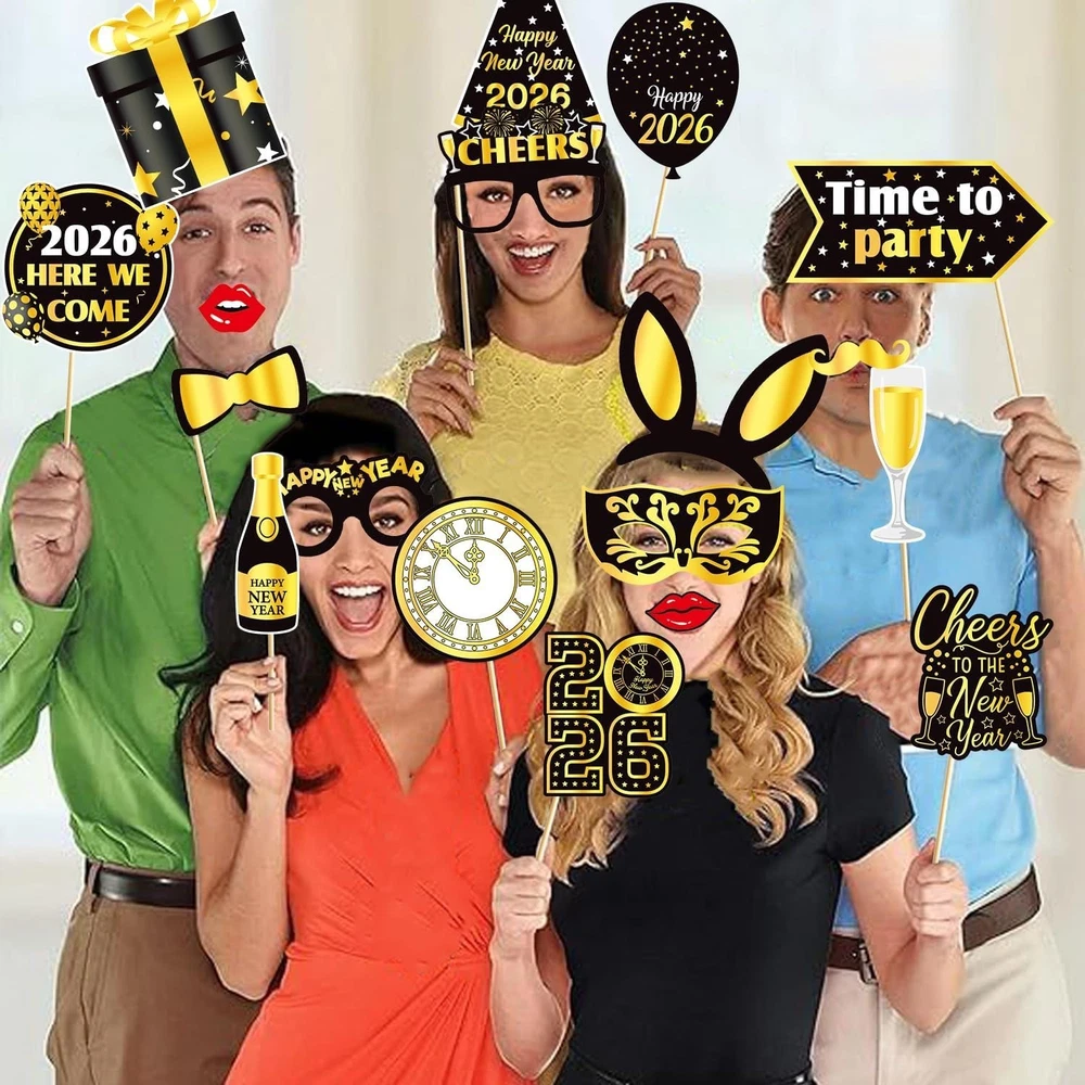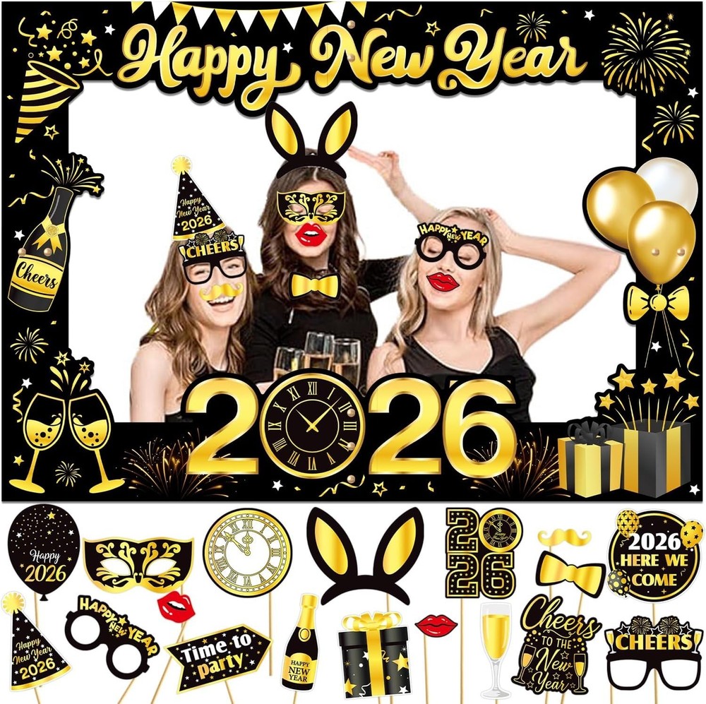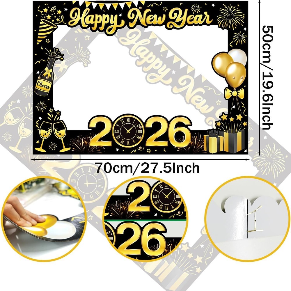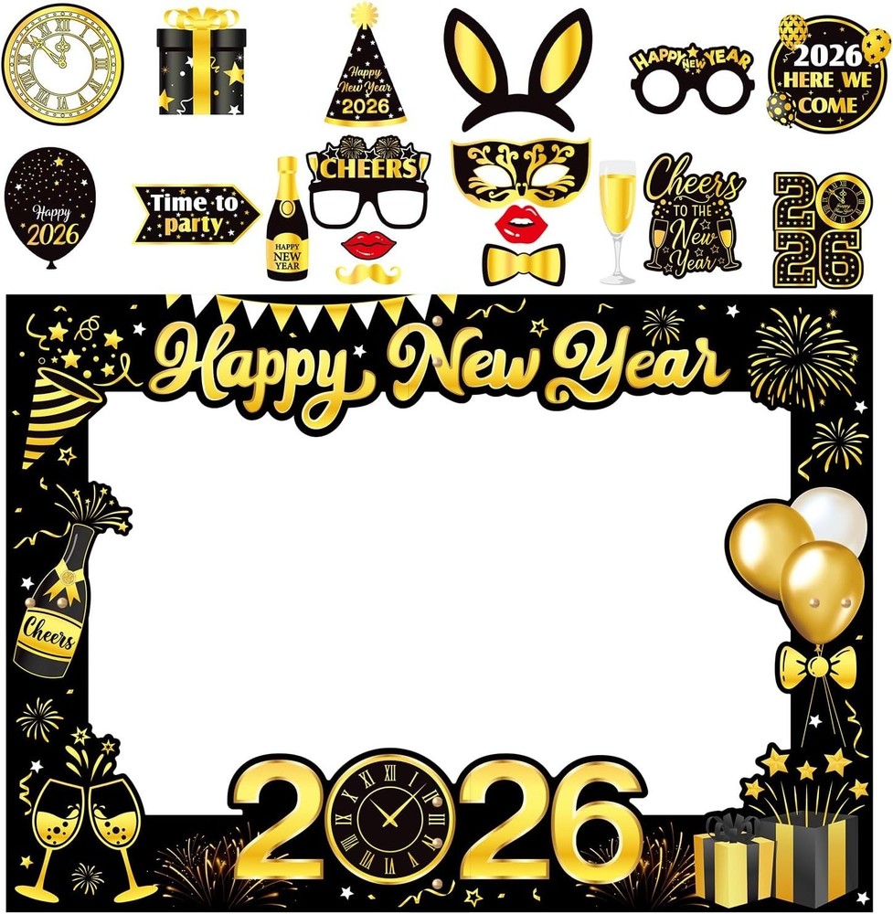 About this item: New Year Eve Party Supplies 2026 : New year 2026 photo booth props set Includes 1set Giant Happy New Year Selfie Frame, 18pcs New Year Photo Booth Props, NYE Photo Booth Props 2026 full of New Year's Eve elements are enough for you to celebrate with your family and friends on New Year's Eve party! Happy New Year Photo Props 2026: 18pcs new year photo props accessories for your face or head, including 2026 glasses, moustache, red lips, hats, 2025 clock, happy new year sign, bow tie etc. Happy New Year 2026 Selfie Frame is very suitable for taking photos in the New Year and capturing beautiful moments. Easy to use:Giant Happy New Year Selfie Frame measure 50x70cm/19.6 x 27.5inch, For more convenient and safe transportation, we have divided it into four parts. You need to use accessories to fix them together, and in a few minutes, you can easily use them High quality material:The New Year photo booth props are made of sturdy thick paper, excellent quality, robust and durable. Widely Application: New years eve decorations are unique and interesting design with some cute pattern.You can make many fun ways to use these cute photo booth props! 2026 New years photo props are perfect for New years party, friends party and family gathering, etc.