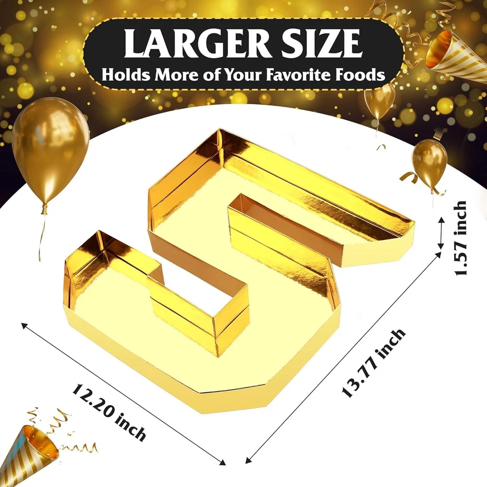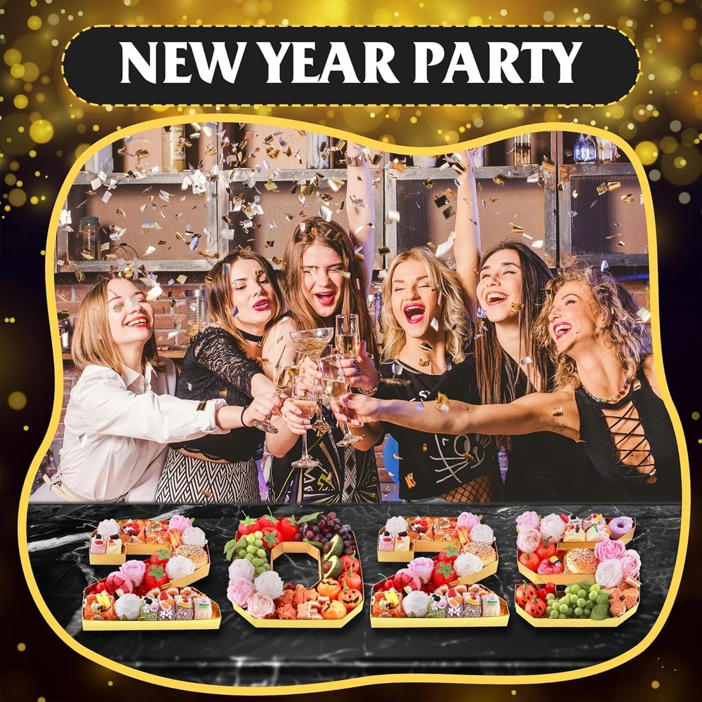 New Years Eve Party Supplies 2025-2025 Number Charcuterie Board Box - 13.7" Fillable Cardboard Number Food Tray for Happy New Year Decorations Charcuterie Cupacke Chocolate Candy Cookies Snacks Box description Premium Quality: Our cardboard letters are crafted from thickened cardboard that resists deformation and breakage. Enhanced with a stylish gold film on the top layer, these numbers 2025 are both waterproof and oilproof(It refers to the oil and water on the food. the item is not rinsable), making them perfect for any occasion and versatile for all your needs. Upgrade your events with confidence Spacious Design: Measuring approximately 13.7 inches high, 12.4 inches wide, and 1.57 inches deep (without lid), our number charcuterie board box offer ample space for your favorite foods. Say goodbye to extra plates! Effortlessly arrange delicious dishes for your family and friends at parties, making every meal look as appetizing as it tastes Chic Event Decor: Make your celebrations unforgettable with the charcuterie numbers fillable "2025". Perfect for Halloween, Christmas, New Year's, birthdays, newborn parties, anniversaries, graduations, Valentine's Day, and other significant occasions, this eye-catching decoration doubles as a stylish snack box Impeccable Design: Featuring a luxurious golden appearance, our charcuterie letters fillable are crafted with smooth edges and exceptional attention to detail. These exquisite pieces are perfect for enhancing the ambiance of any party or family dinner, bringing more joy and elegance to your dining table Diverse Usability: Our number cake pans are not just visually appealing; they are also highly versatile. Suitable for serving a range of foods, including meats, fruits, candies, cakes, chocolates, and desserts, they enhance both presentation and practicality at any even