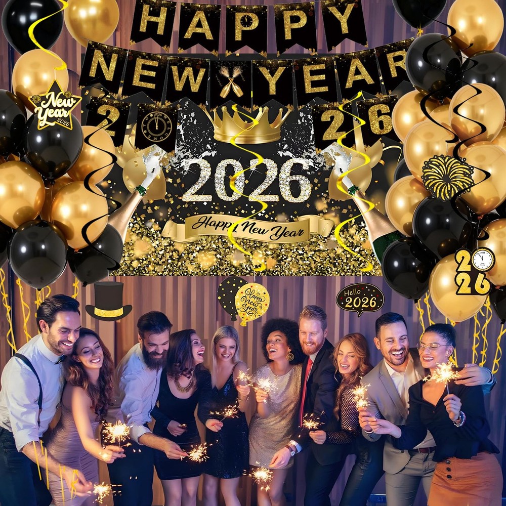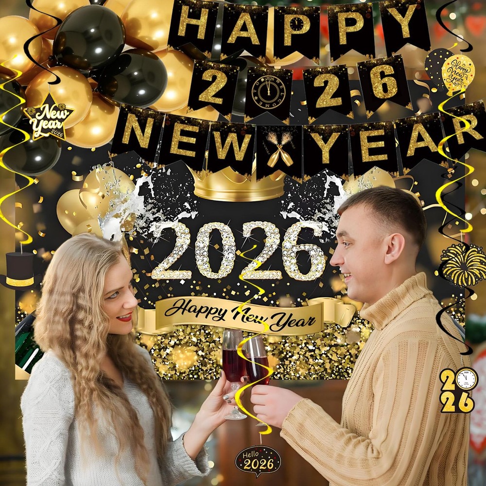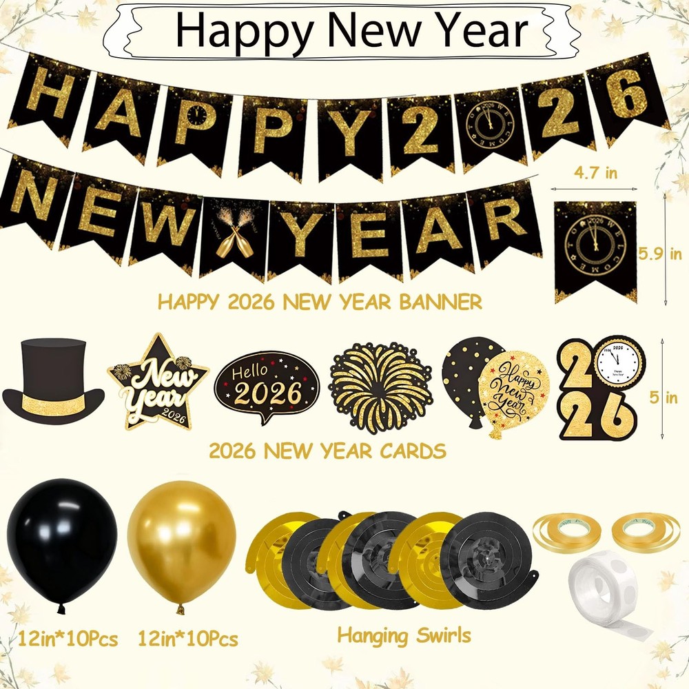 New Years Eve Party Supplies 2026, Happy New Year Banner with Happy New Year Backdrop 2026, Balloons, Hanging Swirls for 2026 Years Decorations 2026 New Years Decorations: Our happy new year 2026 include 180cm*110cm 2026 new years backdrop, 2026 happy new year banner, 6pcs 2026 new year cards with 6pcs hanging swirls, 10pcs 12'' black latex balloons, 10pcs 12'' gold metallic latex balloons, ribbon, glue dot New Years Eve Decorations 2026: The 2026 Happy New Year decorations is composed of dazzling gold and steady black, highlighting a noble and elegant atmosphere. It is the perfect choice for New Year parties and is perfect for adding elegance and nobility to this special New Year decoration moment, creating a special and unforgettable moment for your loved ones and family Happy New Year 2026: Do you want to give your loved one a beautiful and unforgettable New Year? Do you want to add some beautiful colors to your loved ones' and family's holiday parties? Our 2026 New Years decorations can perfectly help you achieve it! Through a series of colorful and unappealing decorations, you can easily create a magical atmosphere, allowing your family and friends to spend a beautiful and unforgettable day 2026 New Years Backdrop: Our New Year decorations 2026 is popular among children, girls, women, and men of all ages, suitable for family gatherings, company annual meetings, school classroom themed parties, and more. It can be hung on wall, ceiling, table background, doorway. This is the perfect decoration for our New Year's party. Now, let's enjoy our party happily High Quality: Our New Years eve party supplies are made of the best materials, safe, non-toxic, and durable.However, it is worth noting that balloons should try to avoid overheating, sharp objects, and excessive friction, otherwise they are prone to bursting
