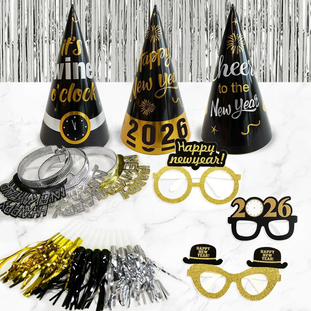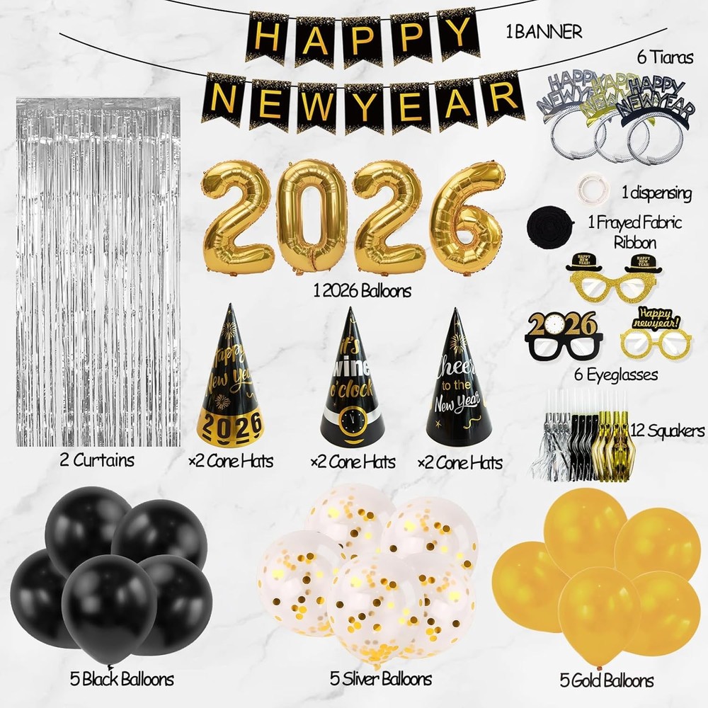 New Years Eve Party Supplies 2026 - Happy New Year Decorations Kit - Set of 50 Includes Banner, Hats, Ribbon, Glasses,Tiaras, Balloons, Squawkers and Fringe Curtains - Accessories for Kids Party Decor Color Gold Material Foil Included Components Banner Unit Count 1.0 Count Brand ORIENTAL CHERRY About this item Get ready for new year's eve party with these items that will serve your party of 12. Includes 50 pieces: happy new year banners, 2026 number balloons, 1 black ribbon for balloons, 5 white balloons with gold confetti, 10 foil balloons (5 black, 5 gold), 6 hats, 6 glasses, 6 tiaras, 12 squawkers and 2 fringe curtains. 32inch large gold “2026” balloons will be impressive for all the guests. The hats arrive unassembled, but we promise it will be easy! Perfect for new year party you want plan at home or in the office!