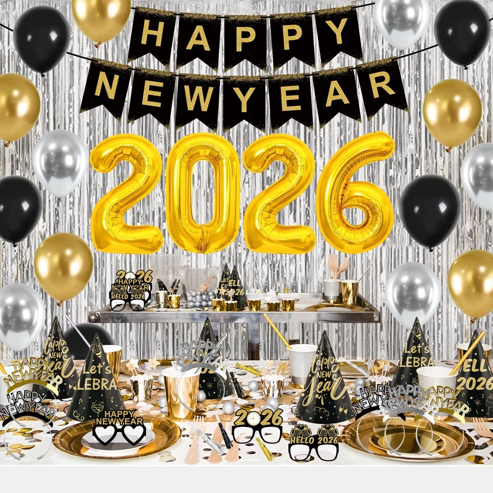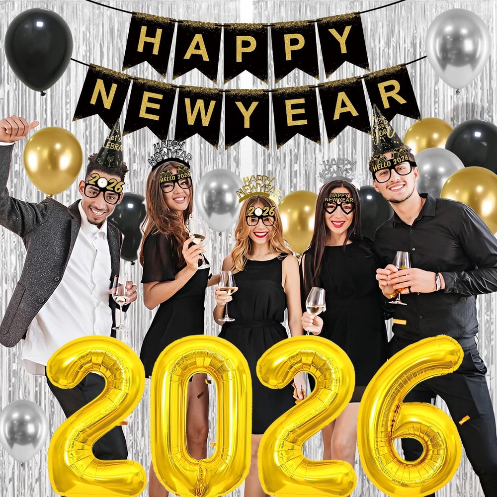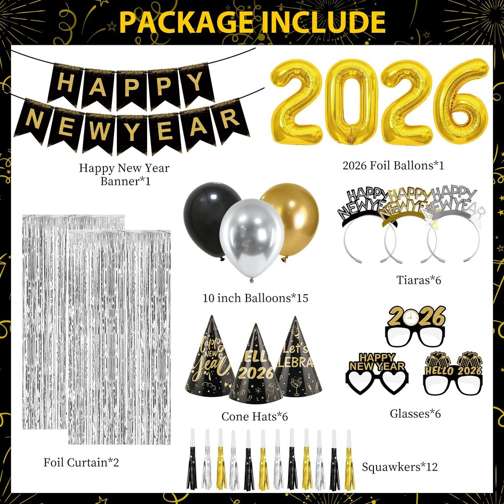 New Years Eve Party Supplies 2026 New Years Decorations Kit: The New Years Eve decorations kit includes Happy New Years Banner* 1, Foil fringe curtains* 2, 2026 Foil Ballons* 1, 10 inch Balloons* 15, New Years Glasses* 6, Happy New Year Tiaras* 6, Cone Hats* 6, Squawkers* 12. More than enough to cover your 2026 New Year's Eve party decoration needs—delivering an unforgettable party experience. Happy New Year Decoration 2026: Our New Year's Eve party supplies boast a black, gold, and silver theme, crafting a cheerful vibe for parties and gatherings. With a simply elegant, shiny, and beautiful style, this set’s props are perfect for catching guests' eyes during New Year’s holiday celebrations, and they also help capture all memorable moments while lighting up your 2026 New Year’s Eve night. Premium Materials: Our NYE decorations are made of premium materials. The foil curtains and 2026 number balloons feature glittering elements to elevate the charming party atmosphere—ideal for welcoming the new year. Sturdy cardboard materials also allows reuse for future celebrations. Easy to Assemble: Our New Years Eve party decorations are simple to put together. The banners come pre-assembled for easy installation, and the hats are easy to assemble—so you can spend less time setting up and more time enjoying the party with family and friends to celebrate the new year’s arrival. Versatile Occasions: They’re excellent decorations for party backgrounds and festive occasions. They’re also ideal for homes, offices, and event spaces—suitable for New Year’s Eve parties, holiday gatherings, family get-togethers, Christmas parties, and even as photobooth props, etc. These New Years accessories elevate New Year’s Eve party vibes and festive atmosphere, creating a vibrant, fun-filled space for New Year’s Eve countdowns and celebrations.
