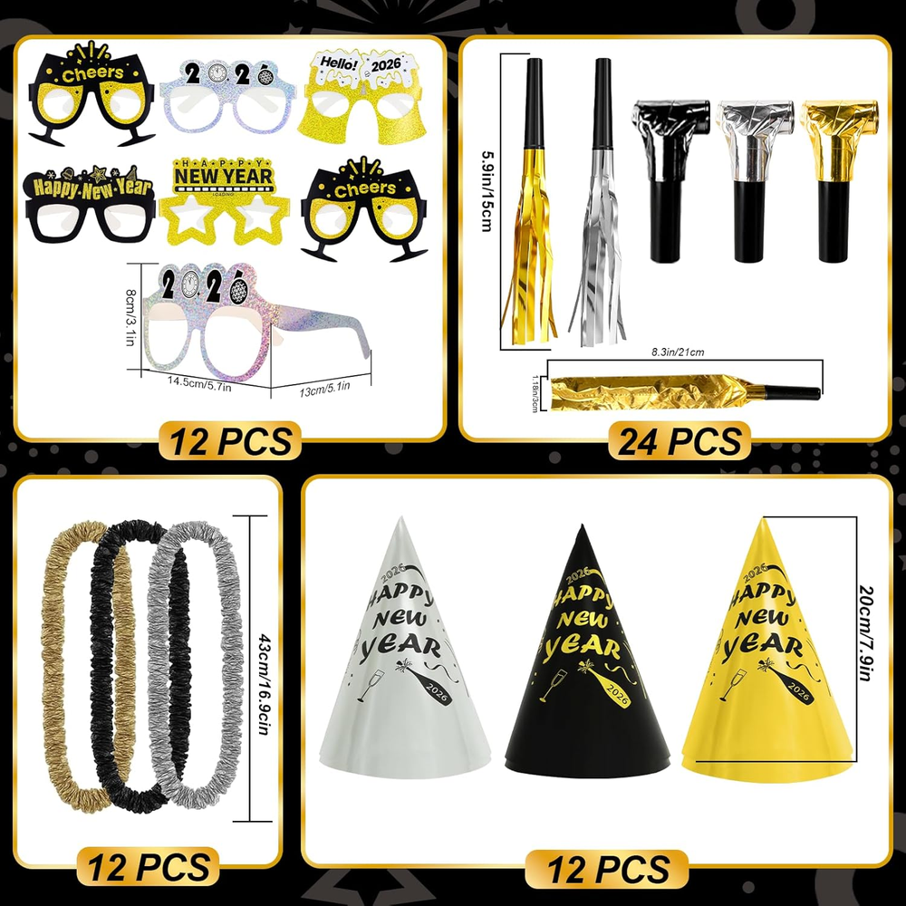 Store New Arrivals Add to Favorite View Feedback Contact New Years Eve Party Supplies 2026 for 24, New Years Eve Party Decorations, a Banner, 12 Hat, 12 Glasses, 24 Blowouts, 12 Leis, 12 Necklaces 2 Foil Fringe Curtains,32 Inches "2026" Foil Balloons Description Color Gold Pattern Firework, Glitter Product Dimensions 1 x 1 x 1 inches Material Cardstock, Plastic Item Weight 1.85 pounds Theme New year Manufacturer recommended age 18 months and up Occasion New Year's Included Components Banner New Years Eve Party Supplies 2026 - This pack includes a happy new year banner, 2 foil fringe curatin, 32 inches "2026" foil balloons, 12 glasees, 12 cone hats, 24 blowouts,12 leis and 12 nacklaces Quality Material - Our 2026 New Years Eve party supplies—including cone hats and glasses—are crafted from sturdy cardstock and durable plastic-paper. Safe, odor-free, and kid-friendly, perfect for New Year gatherings Unique Design: Our nye party favors set features “Happy New Year”, reflective firework patterns, plus subtle glitter details on headbands. Under party lights, it emits a soft glow—helping everyone stand out naturally in the crowd while adding strong festive vibes to group photos. It effortlessly turns wonderful moment into unforgettable 2026 New Year snapshots Easy to Use: The new years decor set assembles quickly without tools, features lightweight materials for comfortable wear. It includes ready-to-use noise makers, is easy to fold, store, and reuse after parties, ensuring convenience and hassle-free use throughout Perfect for Every New Year Occasion: Whether it’s a home New Year’s Eve party, family reunion, friend get-together, or even office celebrations—this kit has all the decor you need. It’s also a great New Year gift for kids or friends, bringing joy and festive vibes to their celebration New Years Eve Party Supplies 2026 ABOUT US We offer the best prices around on high quality products. Our E-store includes media such as books, movies, music and games while offering electronics, toys, sporting apparel, clothing, tools, general home, garden items and more. SHIPPING We are always working hard to ensure your package arrives as soon as possible. Please understand that some factors like weather, high postal traffic, and the performance of shipping companies are outside of our control. We offer free shipping to the lower 48 states and ship within 2 business days of payment, usually sooner. We do not accept P.O. Boxes. Please provide a physical address. For shipping outside of the continental USA, we only use eBay's Global Shipping Program.The item is shipped to KY and then sent to the rest of the world. International customers are responsible for all duties and taxes. Continue to check out in order to calculate costs for shipping the item to your country. Messages regarding eBay's Global Shipping Program MUST be directed at eBay EXCLUSIVELY. RETURNS We offer a 30-Day Return Policy on items which you are not completely satisfied with. You have the option for a full-refund or an exchange of the item. No returns are available on items shipped outside of the USA. PAYMENT We accept PayPal. CONTACT US This page content is yet to come Please ad us to your favorite seller and visit again later Thank You CUSTOMER SATISFACTION We try our very best to make sure every customer is completely satisfied. If there's a problem, message us! We're happy to help. WE ACCEPT