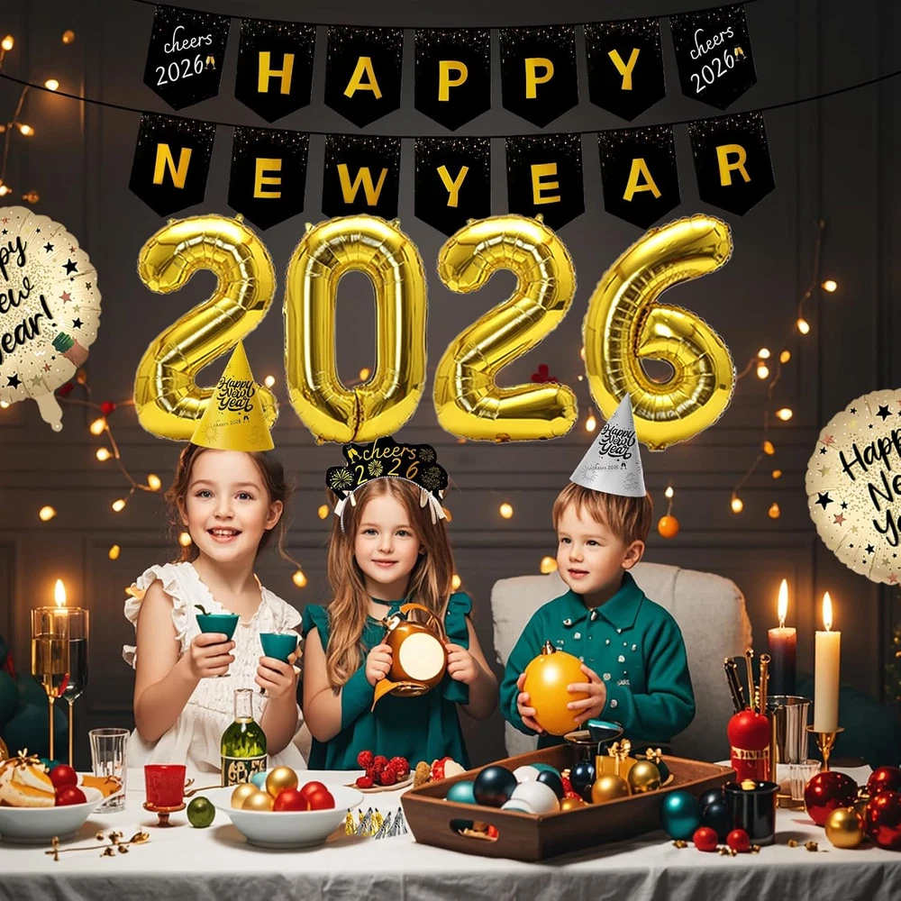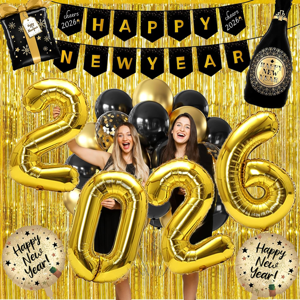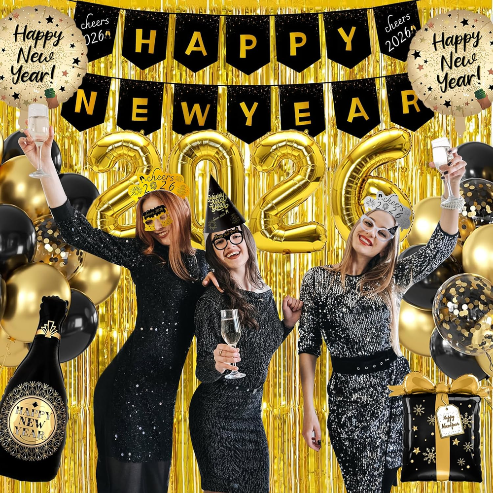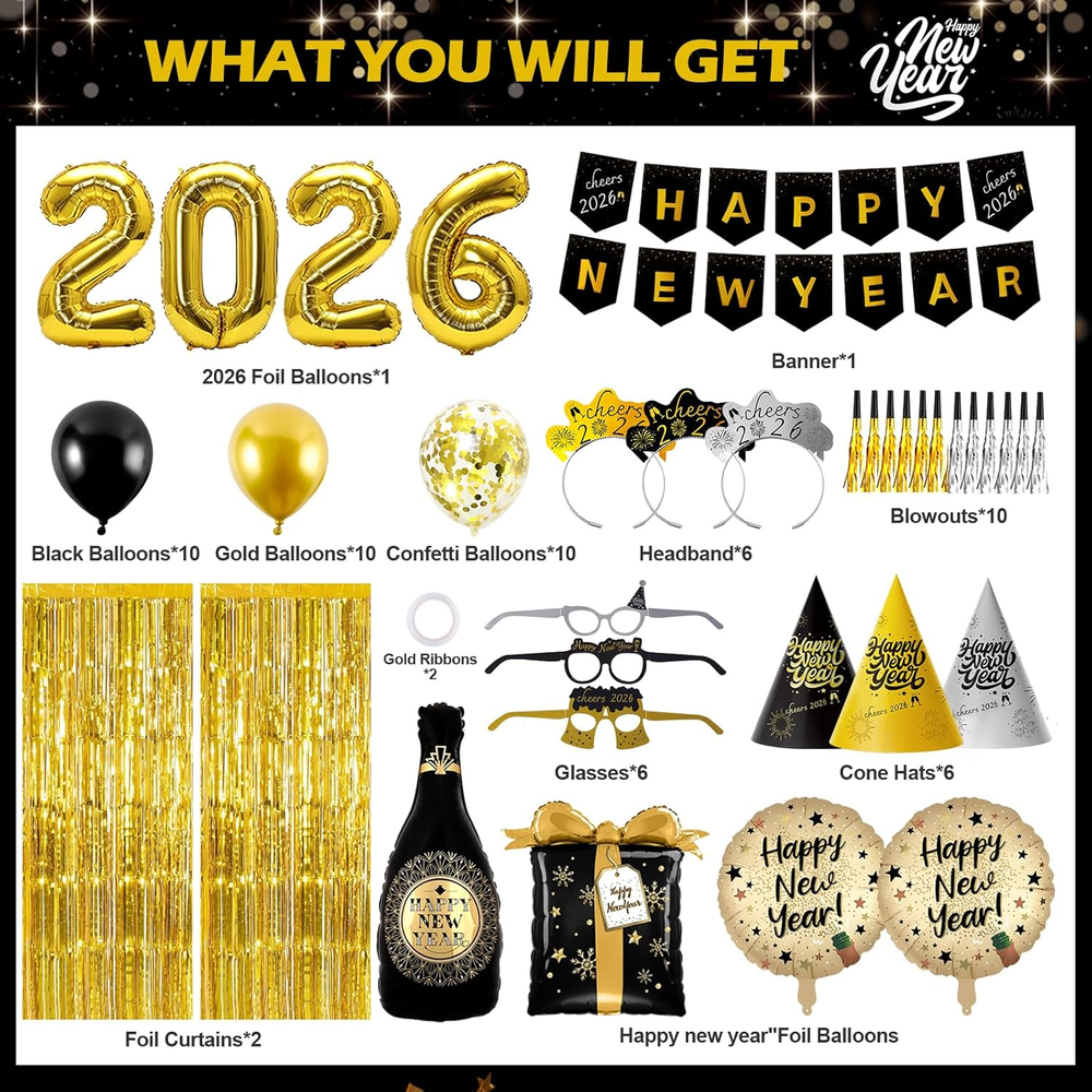 Elevate Your Celebration: Prepare for an unforgettable new years eve bash with our all-inclusive 2026 new years eve party supplies! This complete kit caters to up to 12 guests, featuring 6 hats, 6 glasses, 10 party squawkers Blowers , 6 tiaras, 2 champagne-shaped balloons, 2 star-shaped balloons, 2 fringe curtain, a set of "2026" balloons, a happy new year banner, and 30 assorted balloons. Everything you need for a dazzling celebration is neatly packed in one box. Convenience Redefined: Bid farewell to last-minute shopping hassles. Our new years eve decorations offer a hassle-free experience, ensuring you have all the essentials for hosting a flawless party. From fun accessories to stunning decorations, each item is meticulously chosen to guarantee your party is a resounding success. Easy assembly lets you focus on making memories with loved ones. Versatile and Vibrant: Whether it's an intimate family get-together, an office soirée, or a lively bash with friends, this new years eve party supplies set is versatile for any occasion. The assortment of items ensures a memorable and fun-filled event, regardless of the setting. Hats, glasses, squawkers, and tiaras infuse a playful spirit, making it effortless for everyone to embrace the festive vibe. Chic Black and Gold Touch: Transform your New Year's Eve celebration with our sophisticated black and gold-themed new years decorations . The elegant color palette exudes luxury and refinement, setting the stage for an opulent party. Impress your guests with large gold "2026" balloons, complemented by black and gold balloons and shimmering sequin background, creating the perfect background for capturing special moments. Craft Memories That Last: More than just decorations, our 2026 new years decorations help you create lasting memories with those you cherish. The nye decorations kit is made from premium materials to ensure a polished look that endures through the night. The champagne-shaped and star-shaped balloons, along with the sequin backdrops, add a touch of glamour, perfect for photo opportunities. The happy new year banner and "2026" balloons serve as stunning background accents, guaranteeing a party to be cherished. Celebrate in style and forge unforgettable moments at your 2026 new years bash! Product description 2026 New Years Eve Party Supplies Happy New Years Decorations 2026 Kit