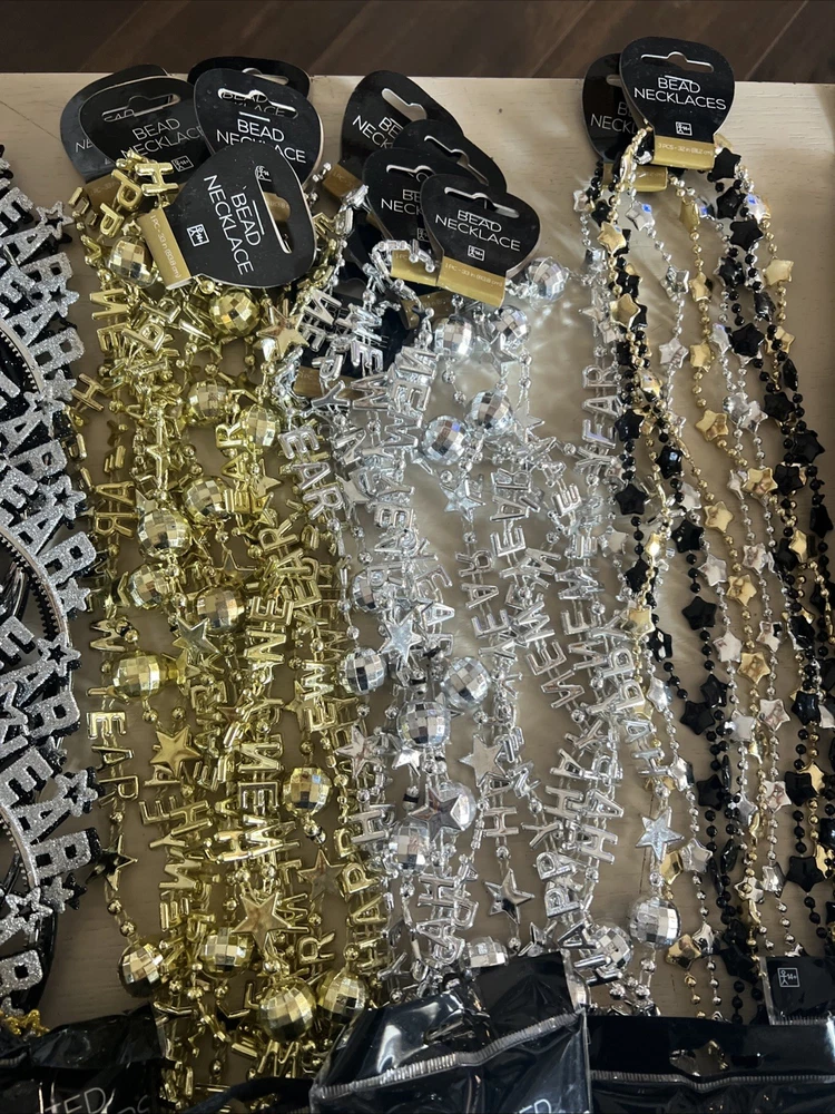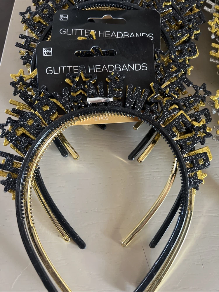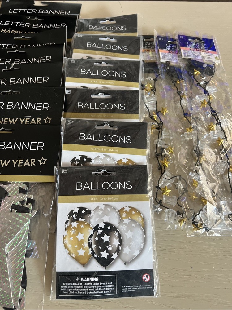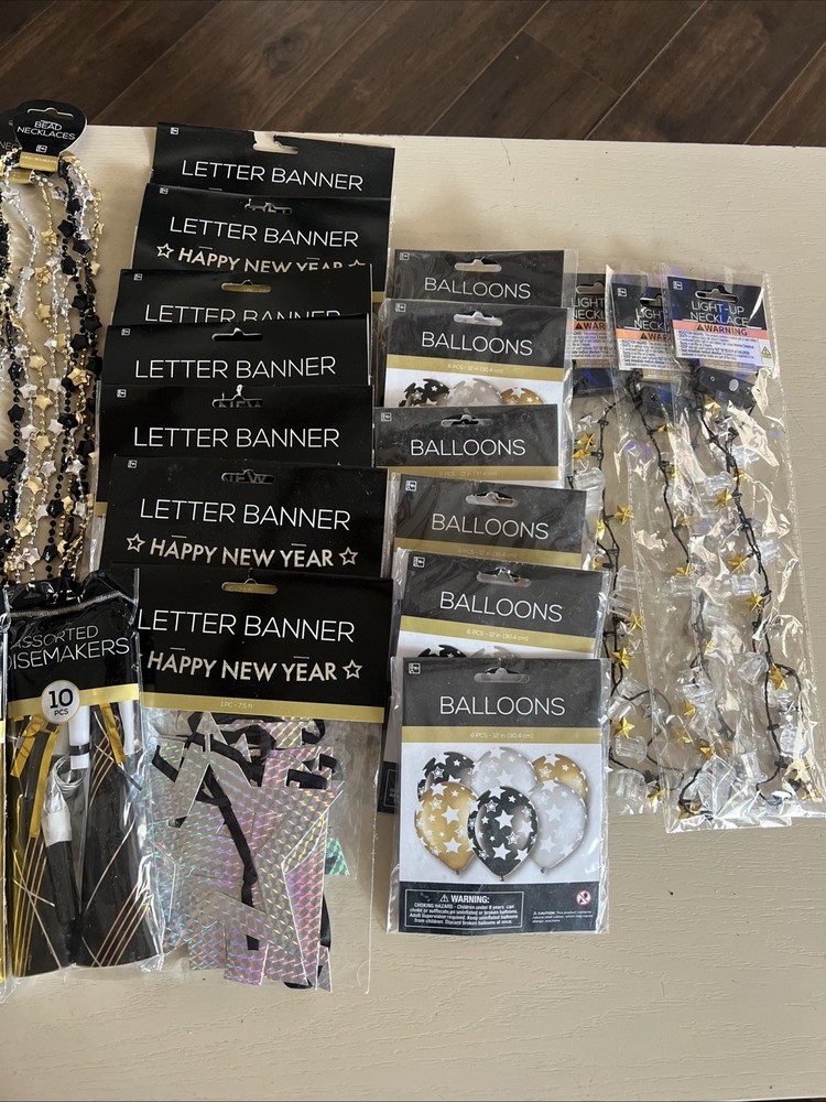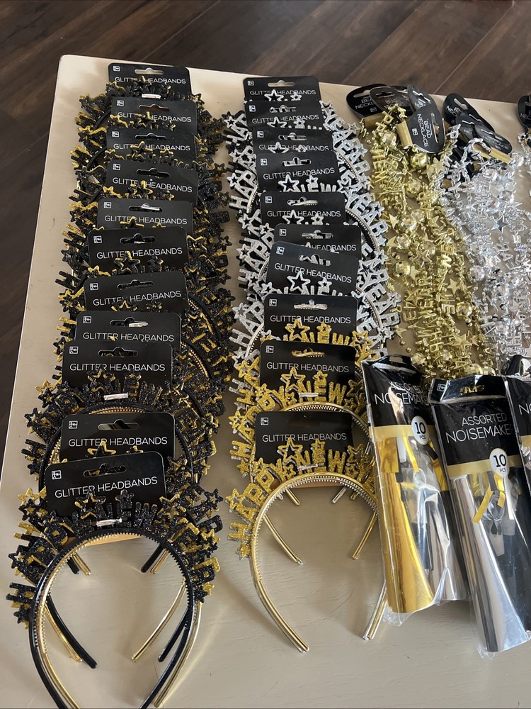 Large lot for New years Eve celebration. 22~Black and Gold Glitter headbands. Total. 6~Gold and Silver Glitter headbands. Total. 14~ Silver and Black Glitter headbands. Total. 50 ~Total Noisemakers. 18 ~Total Bead Necklaces. 7~ Happy New Years Banners. 6 packages of air filled balloons. ( 6 per pack. 36 total Balloons) 3~ Light up necklaces Total. New and in packages. 156 total individual pieces included .